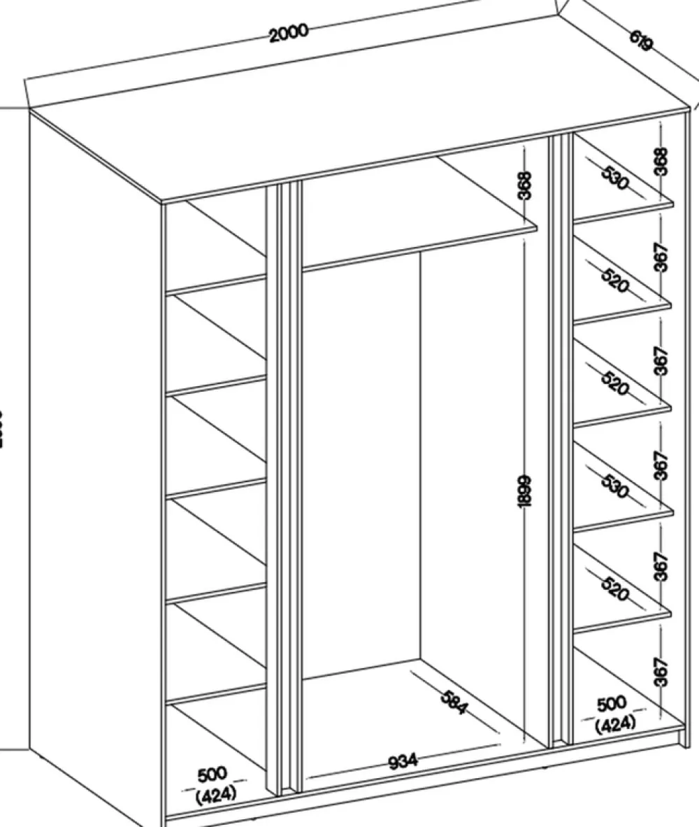 Wnętrze szafy zostało starannie zaprojektowane, aby sprostać różnorodnym potrzebom przechowywania. Po prawej i lewej stronie znajdują się po sześć przestronnych półek, idealnych do przechowywania ubrań, pościeli oraz innych akcesoriów. Centralna część szafy została wyposażona w dodatkową półkę oraz solidny metalowy drążek na wieszaki, co umożliwia wygodne przechowywanie odzieży na wieszakach, takich jak płaszcze, sukienki czy koszule.