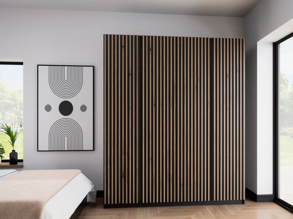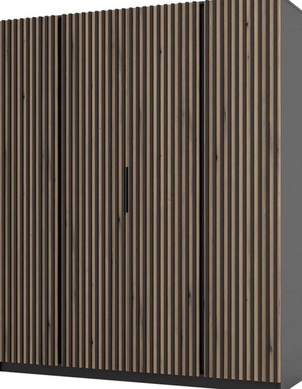 - Szafa z lamelami do sypialni KARAT posiada 200 cm szerokości, które obejmują czworo drzwi wzbogaconych o lamele. Szafa posiada sześć półek za lewymi i prawymi drzwiami. W centralnej części znajduje się półka oraz drążek na wieszaki.