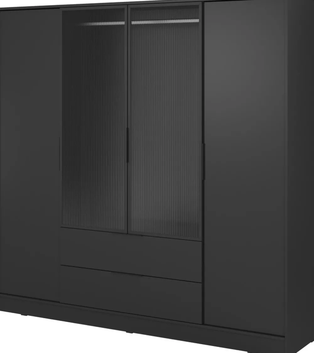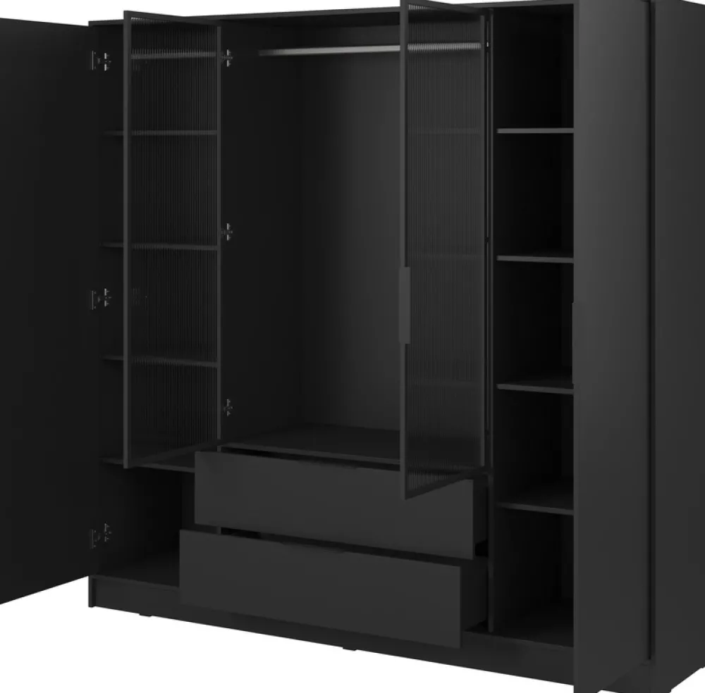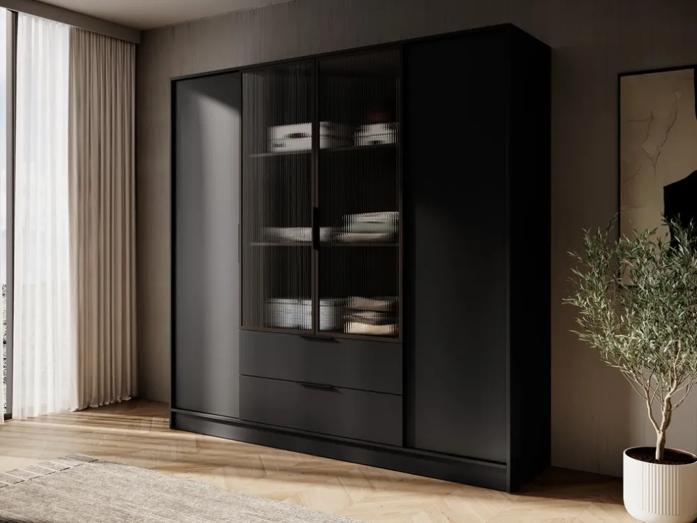Centralna część szafy zachwyca parą przeszklonych drzwi, za którymi umieszczono drążek na wieszaki lub opcjonalnie trzy półki. Ta uniwersalna przestrzeń pozwala na dopasowanie szafy do indywidualnych potrzeb – możesz powiesić tam płaszcze, marynarki lub wybrać dodatkowe półki, by zyskać miejsce na przedmioty, które chcesz mieć pod ręką i w zasięgu wzroku.