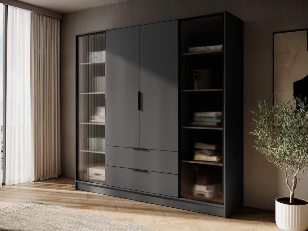 Ta wyjątkowa szafa z witryną KAMIS to idealne rozwiązanie dla osób, które cenią sobie styl oraz funkcjonalność. Przemyślany układ pozwala na wygodne przechowywanie zarówno ubrań, jak i przedmiotów codziennego użytku. Po obu stronach szafy znajdują się przeszklone drzwi, za którymi ukryto aż pięć pojemnych półek. To idealne miejsce na ekspozycję ozdobnych przedmiotów, książek czy dekoracji, które dodadzą wnętrzu unikalnego charakteru.
