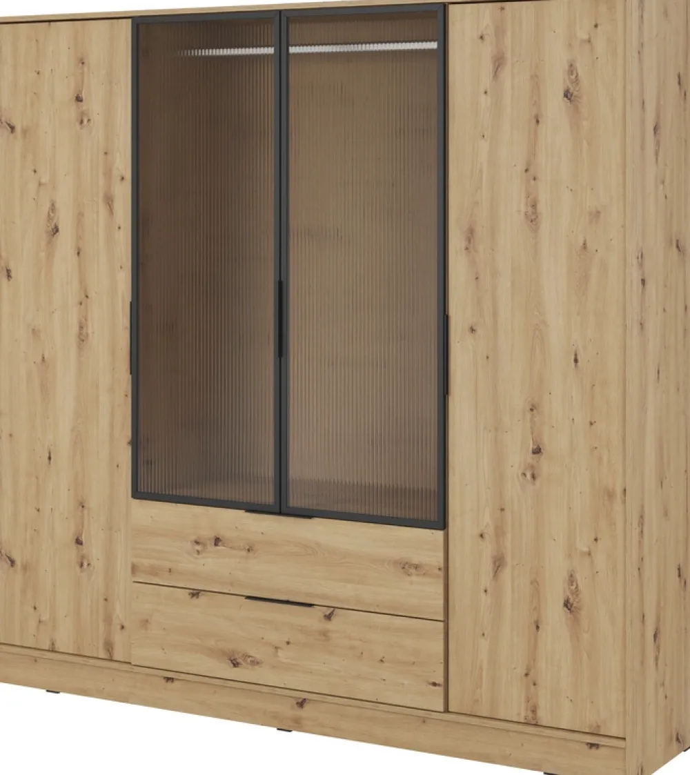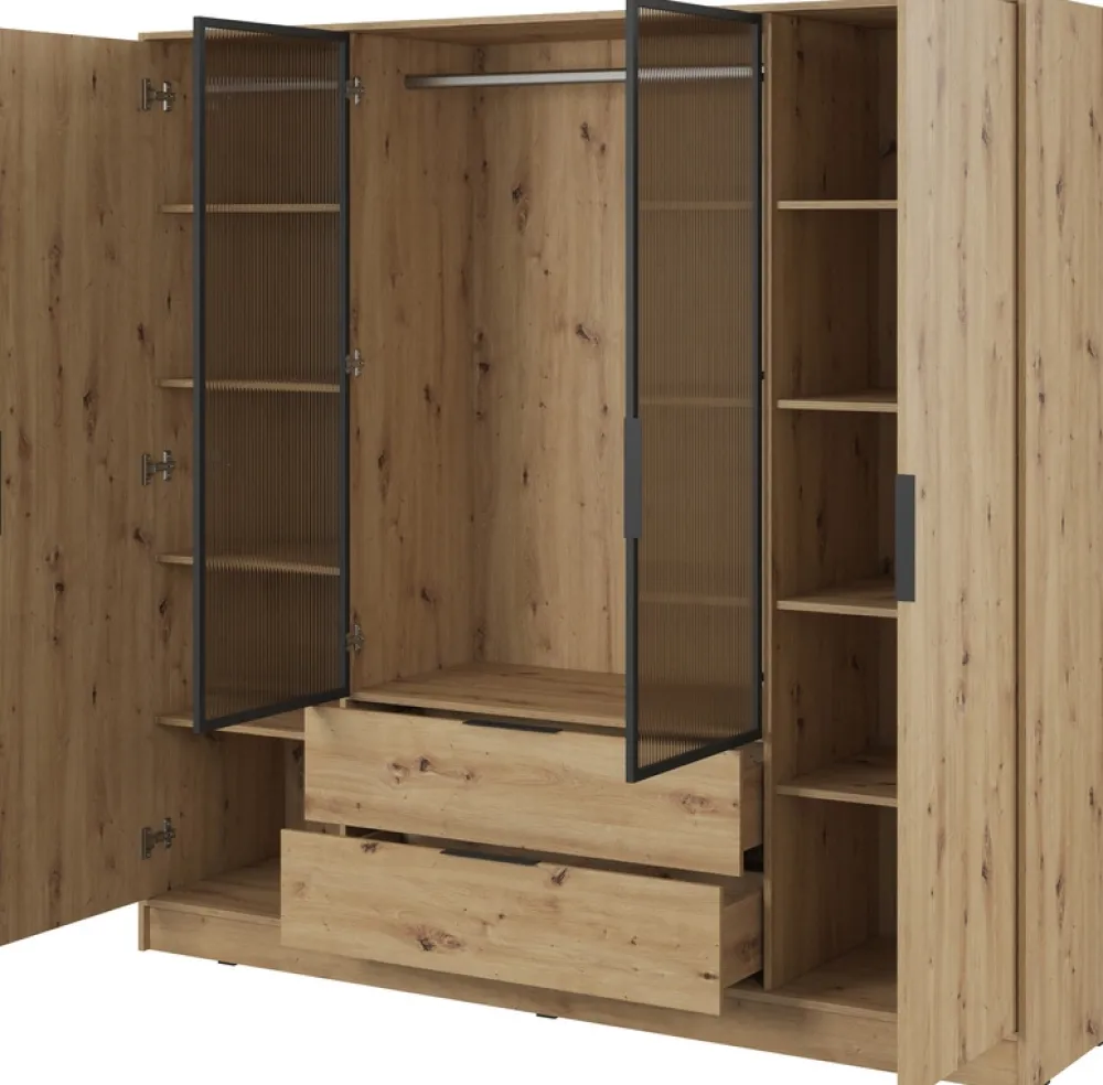 Centralna część szafy zachwyca parą przeszklonych drzwi, za którymi umieszczono drążek na wieszaki lub opcjonalnie trzy półki. Ta uniwersalna przestrzeń pozwala na dopasowanie szafy do indywidualnych potrzeb – możesz powiesić tam płaszcze, marynarki lub wybrać dodatkowe półki, by zyskać miejsce na przedmioty, które chcesz mieć pod ręką i w zasięgu wzroku.