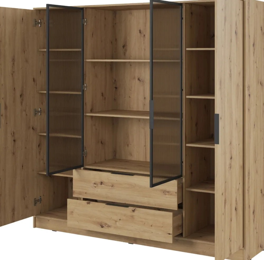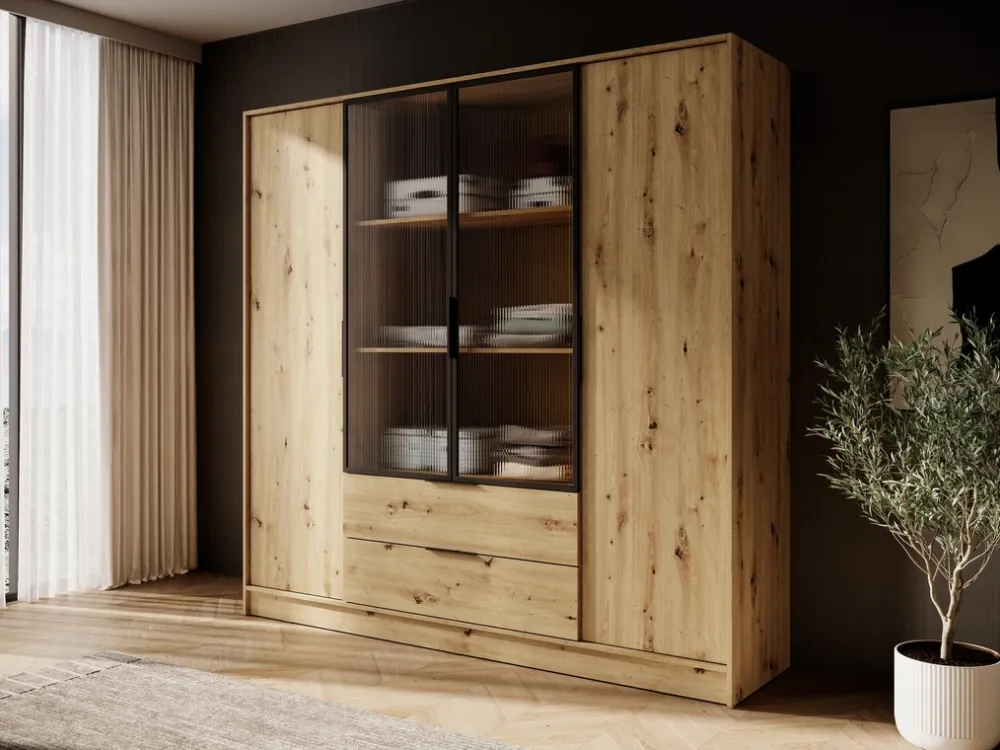 Szafa z witryną KAMIS to doskonały wybór dla osób, które chcą wprowadzić do swojego wnętrza nie tylko praktyczność, ale i wyjątkowy design. Przestronny układ zapewnia wygodę i elastyczność w przechowywaniu różnych przedmiotów. Po prawej i lewej stronie znajdują się pełne drzwi, za którymi kryje się po pięć pojemnych półek – idealnych na ubrania, dokumenty czy akcesoria, które wymagają estetycznego przechowywania.
