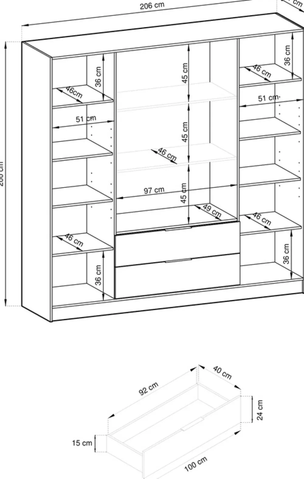 - Szafa uchylna 206 cm KAMIS posiada parę drzwi po prawej i lewej stronie, za którymi znajdują się półki na ubrania. W środkowej części można umieścić drążek na wieszaki lub półki na ubrania i akcesoria, zależnie od własnych preferencji.