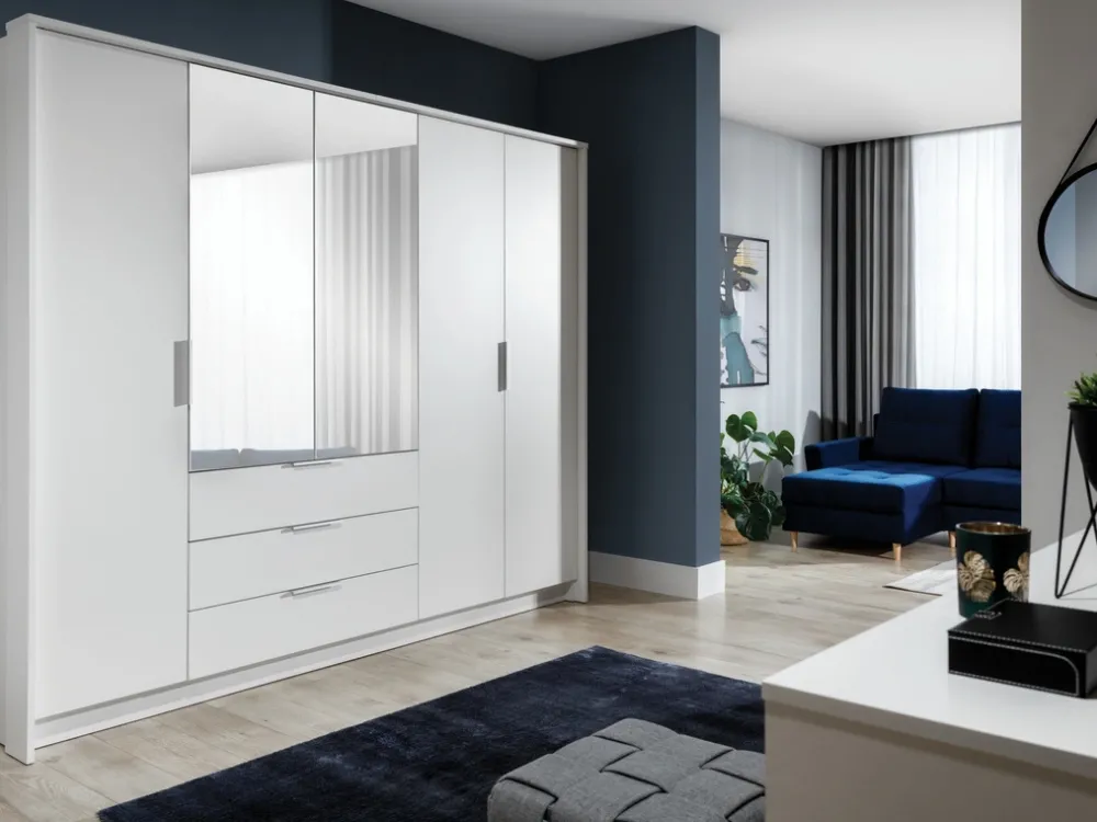 Środkowe drzwi wyposażone są w duże lustro, które optycznie powiększa przestrzeń, wprowadzając do wnętrza więcej światła. Lustro to również praktyczny dodatek, ułatwiający codzienne przygotowania i przymierzanie ubrań. Pod lustrzanymi drzwiami umieszczono trzy funkcjonalne szuflady, które są idealnym miejscem do przechowywania drobniejszych przedmiotów, takich jak bielizna, dodatki czy akcesoria. Szuflady otwierają się płynnie, co podnosi komfort użytkowania.