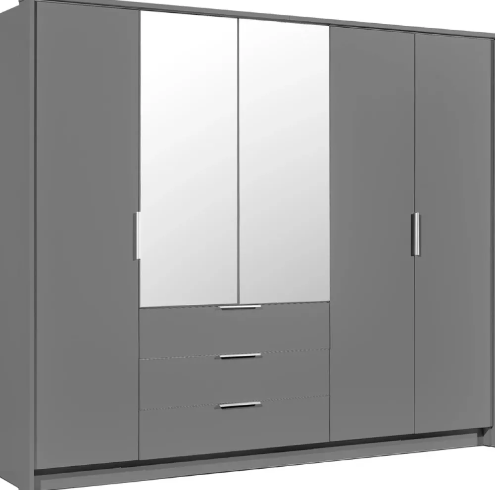 Środkowe drzwi wyposażone są w duże lustro, które optycznie powiększa przestrzeń, wprowadzając do wnętrza więcej światła. Lustro to również praktyczny dodatek, ułatwiający codzienne przygotowania i przymierzanie ubrań. Pod lustrzanymi drzwiami umieszczono trzy funkcjonalne szuflady, które są idealnym miejscem do przechowywania drobniejszych przedmiotów, takich jak bielizna, dodatki czy akcesoria. Szuflady otwierają się płynnie, co podnosi komfort użytkowania.