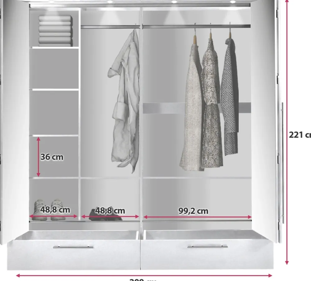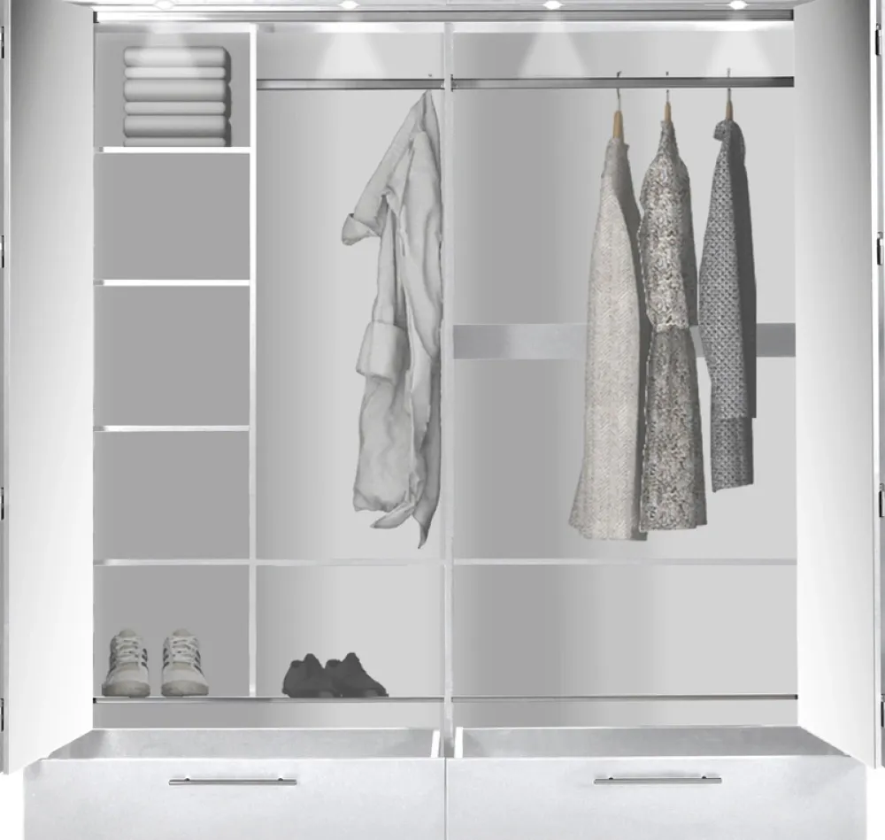 Szafa przesuwna o szerokości 209 cm to idealne połączenie stylu, funkcjonalności i solidności. Przemyślany układ półek, drążków na wieszaki oraz szuflad sprawia, że ten mebel doskonale spełni potrzeby organizacji przestrzeni, jednocześnie dodając wnętrzu nowoczesny, elegancki charakter.