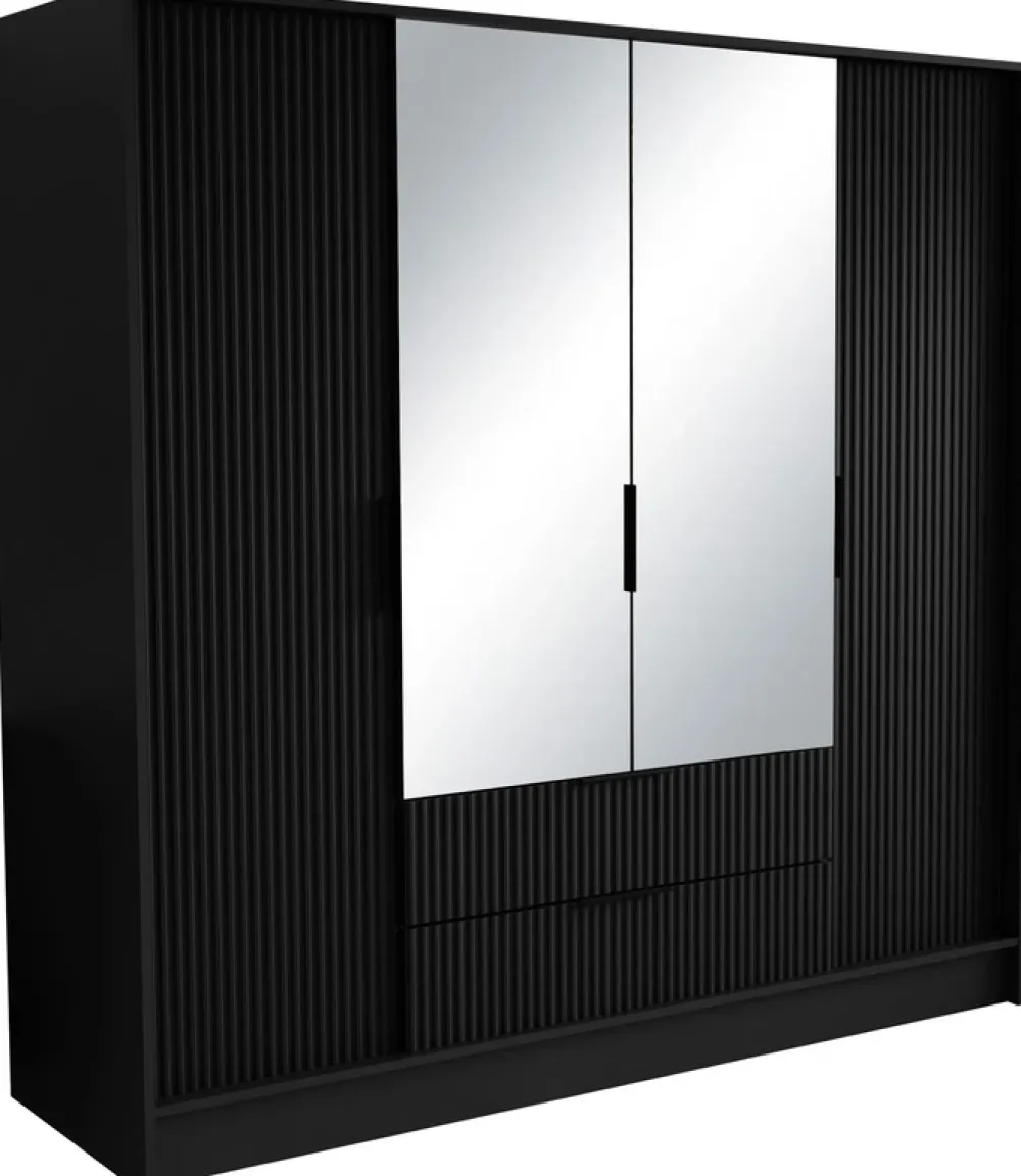 Szukasz przestronnej i stylowej szafy, która zapewni doskonałą organizację garderoby? Model o szerokości 200 cm to idealne rozwiązanie, które łączy klasyczny design z nowoczesną funkcjonalnością. Frezowane fronty z płyty MDF nadają meblowi elegancki charakter, a lustro na środkowych drzwiach optycznie powiększa wnętrze. Przemyślany układ półek, drążka na wieszaki i szuflad gwarantuje wygodne przechowywanie każdego elementu garderoby.
