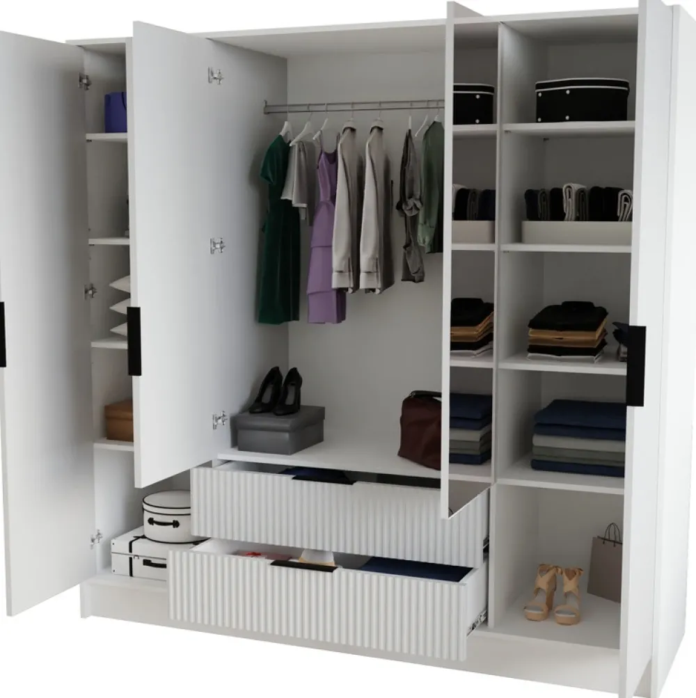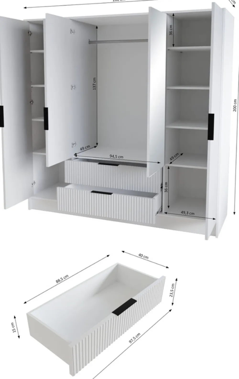 Szafa została zaprojektowana tak, aby ułatwić przechowywanie odzieży i dodatków. Półki po lewej i prawej stronie pozwalają na uporządkowanie złożonych ubrań, pościeli czy akcesoriów. Środkowa część z drążkiem na wieszaki to idealne miejsce na marynarki, płaszcze i koszule, zapewniając im odpowiednie ułożenie bez zagnieceń. Dodatkowo, dwie pojemne szuflady u dołu ułatwiają przechowywanie bielizny, dodatków i innych drobnych przedmiotów.