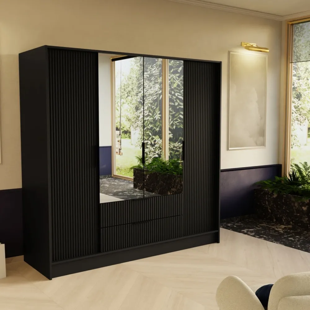 Szafa zachwyca zarówno funkcjonalnością, jak i wyglądem. Lustro na środkowych drzwiach nie tylko pełni praktyczną funkcję, ale także rozświetla wnętrze i sprawia, że przestrzeń wydaje się większa. Frezowane fronty z płyty MDF dodają meblowi elegancji i klasy, a obrzeża zabezpieczone okleiną ABS zwiększają trwałość i odporność na codzienne użytkowanie.