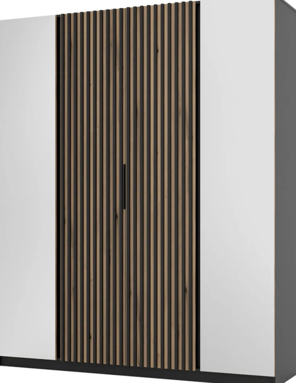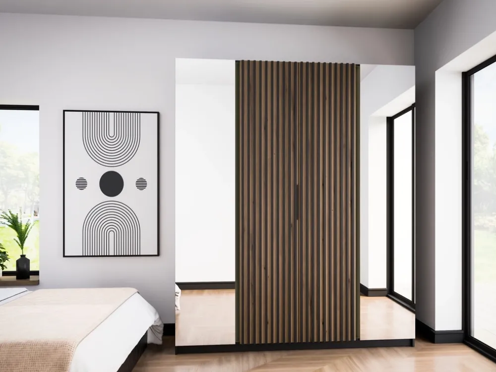 Korpus oraz front szafy KARAT zostały wykonane z wysokiej jakości płyty laminowanej o grubości 16 mm, co zapewnia jej trwałość i solidność. Wyjątkowym elementem są dwa środkowe drzwi z lamelami, które nadają szafie nowoczesny i stylowy wygląd, a boczne drzwi z lustrem dodatkowo powiększają optycznie przestrzeń, wprowadzając więcej światła do wnętrza.