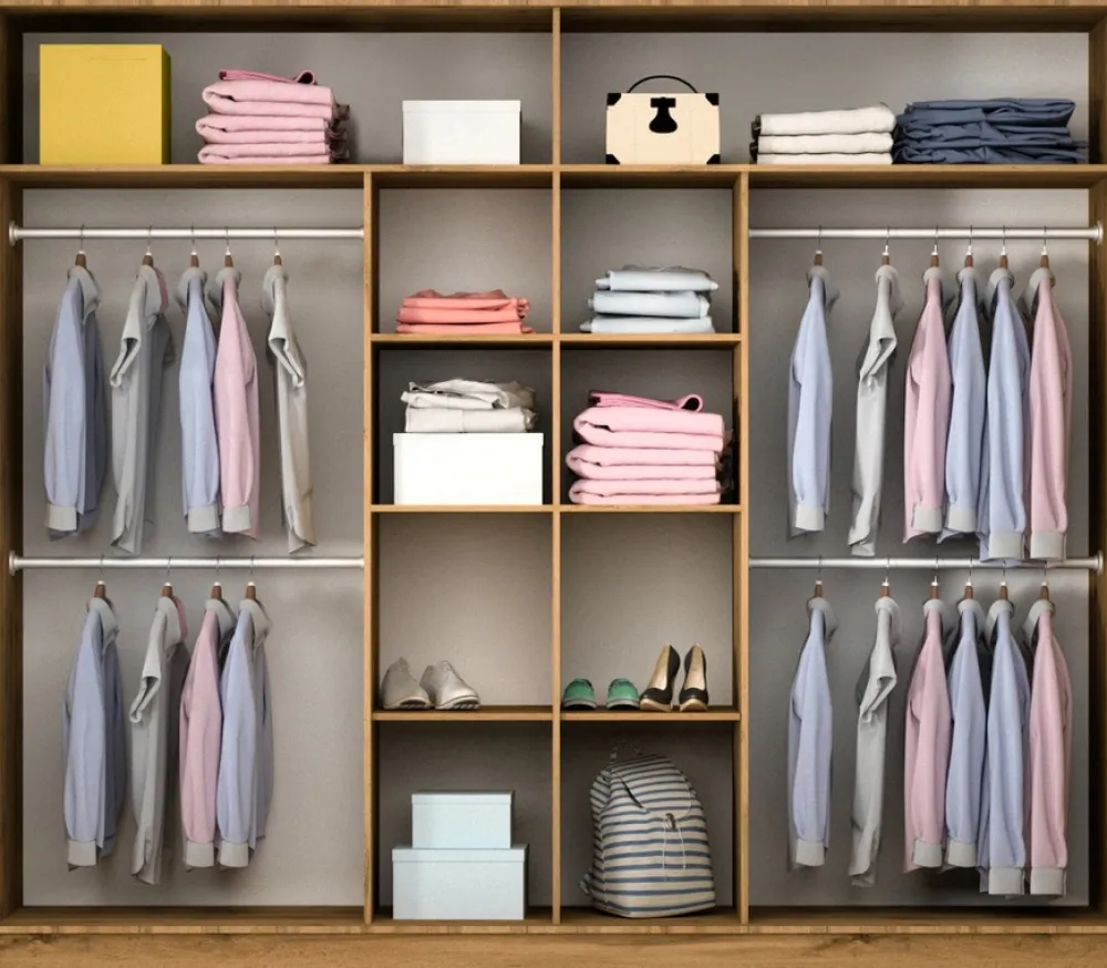 Środkowa część szafy to osiem przestronnych półek, które oferują mnóstwo miejsca na złożone ubrania, pościel czy inne codzienne przedmioty. Dzięki przemyślanemu układowi półek łatwo zorganizujesz swoją garderobę, zapewniając, że wszystko ma swoje miejsce, a porządek będzie prostszy do utrzymania.