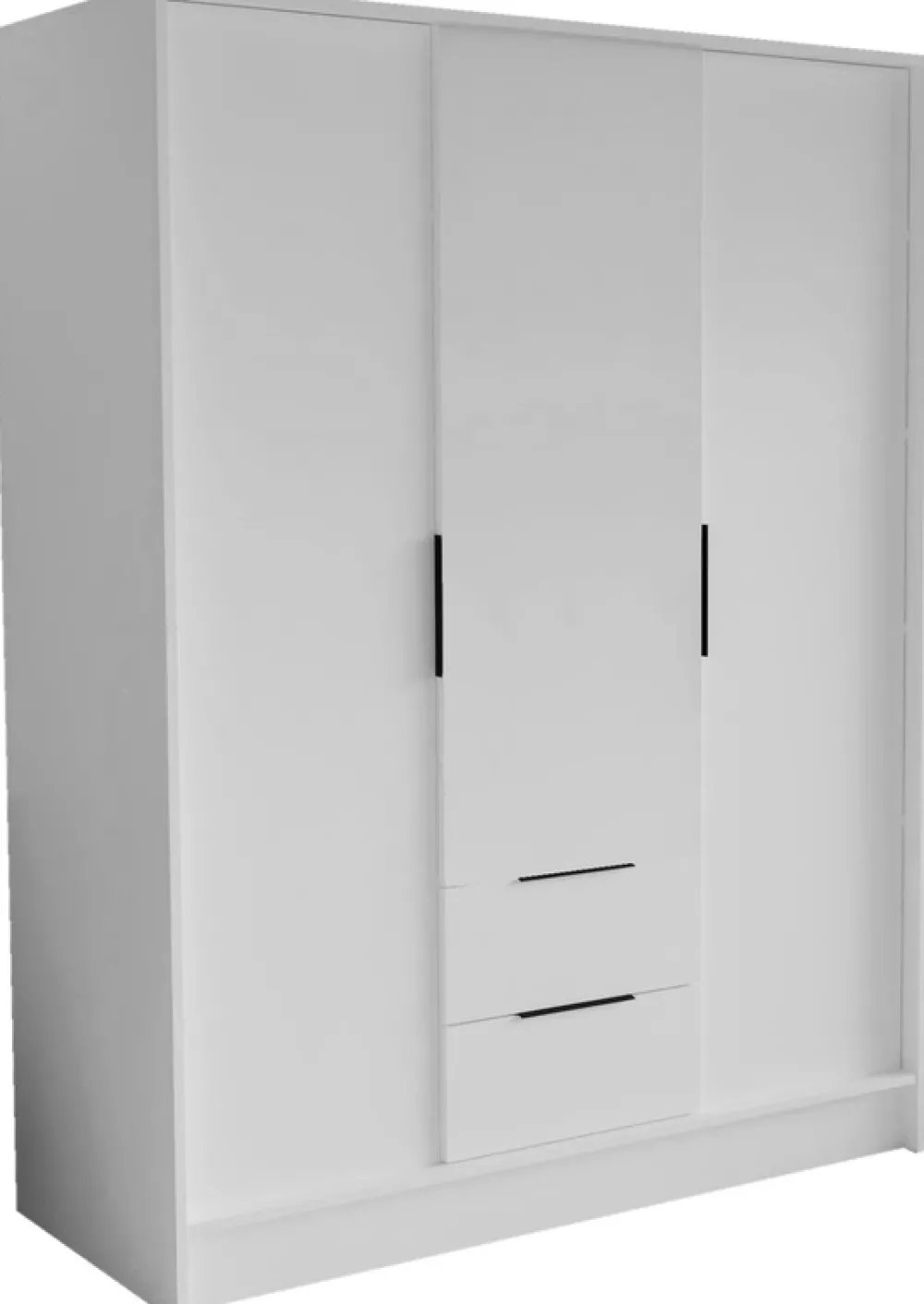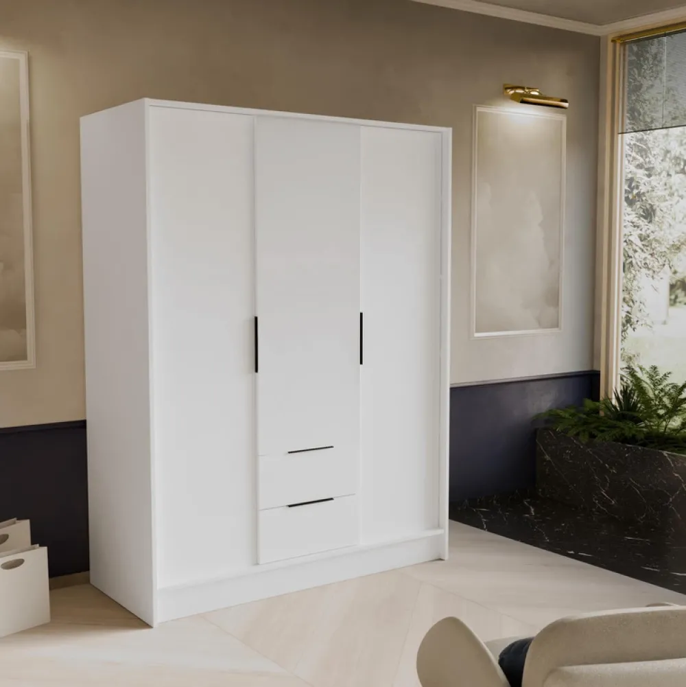 - Szafa uchylna 150 cm NUBIA posiada drążek na wieszaki i dwie szuflady osadzone na prowadnicach kulkowych w środkowej części. Po prawej i lewej stronie znajdują się drzwi, a za nimi półki na ubrania.