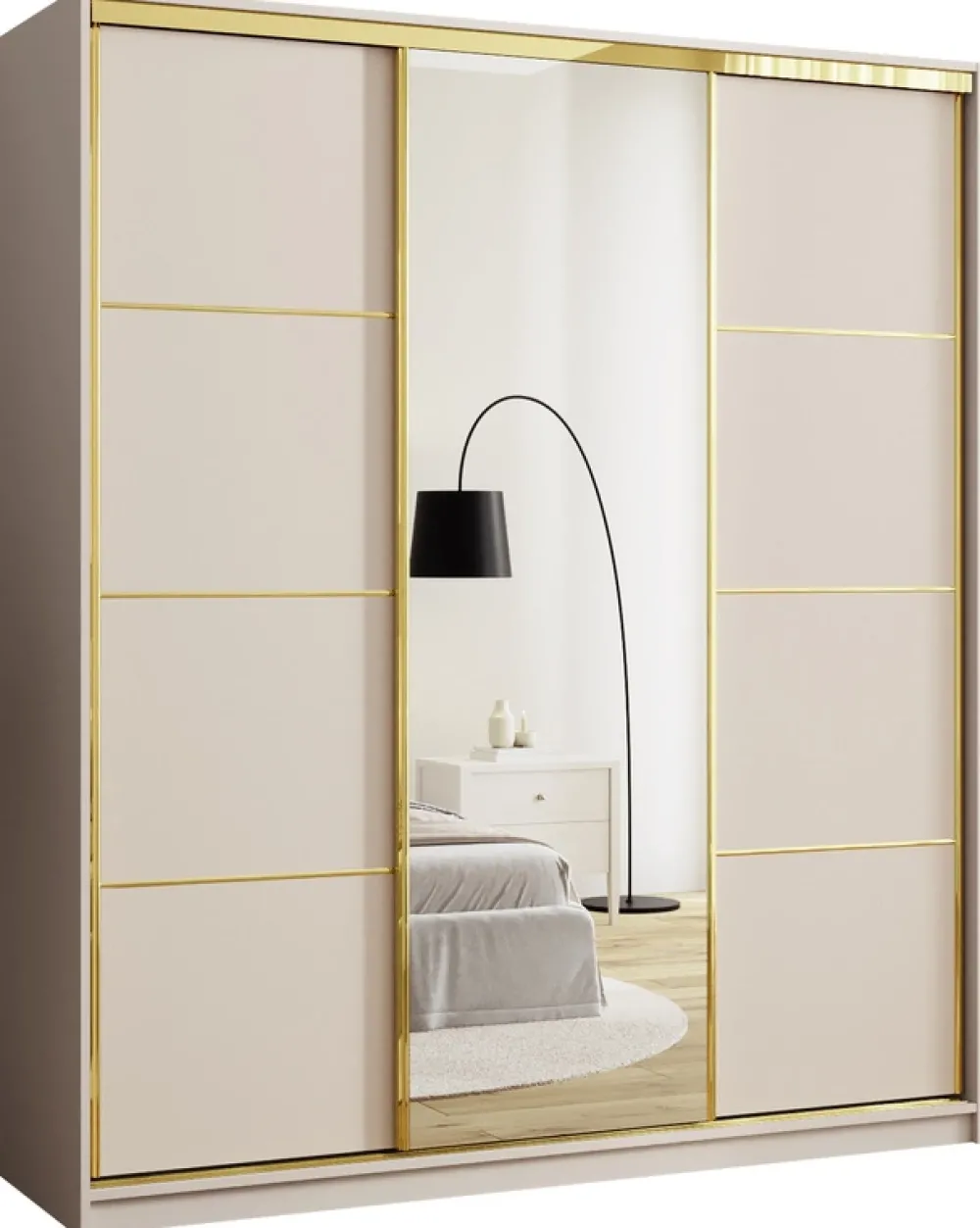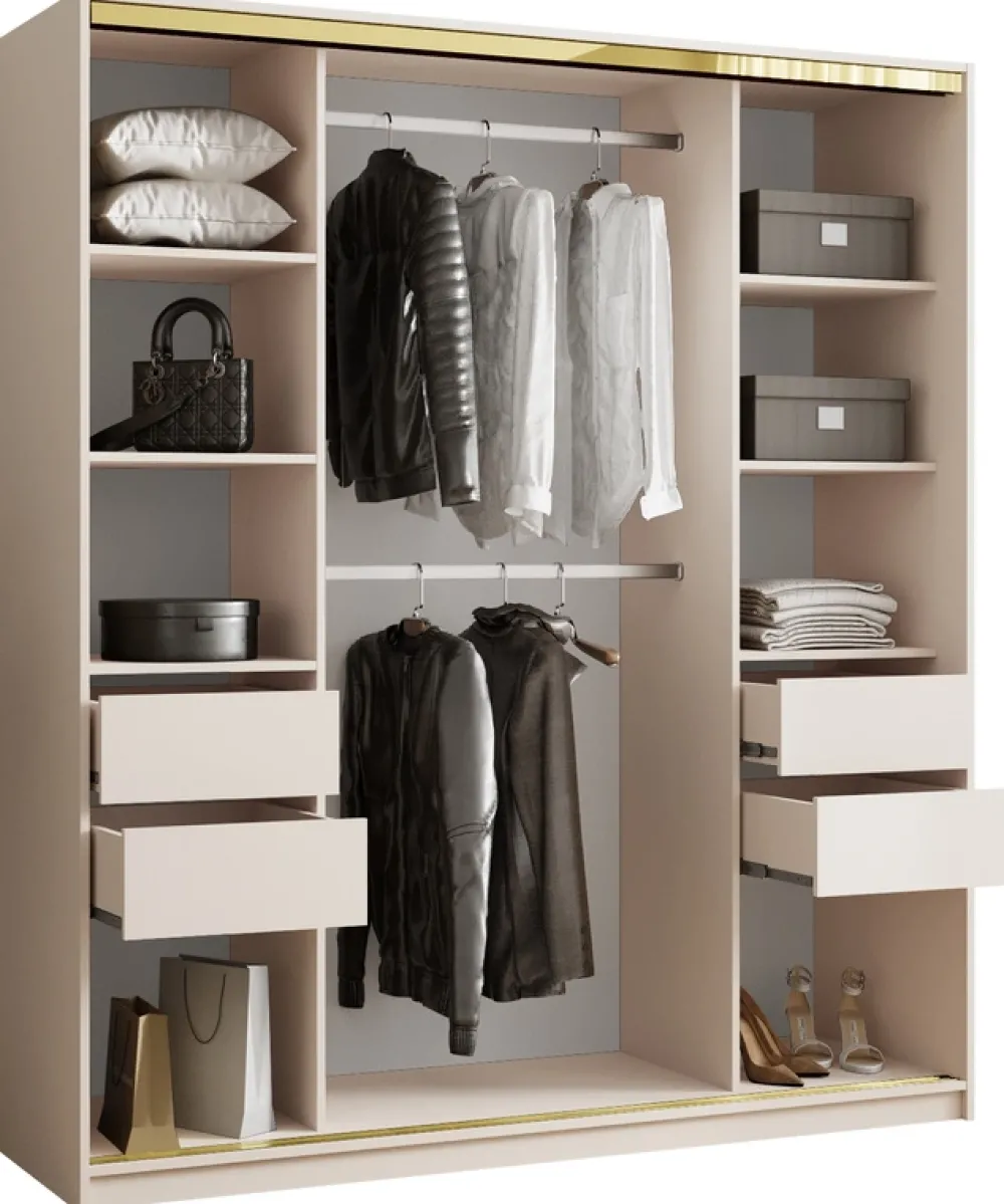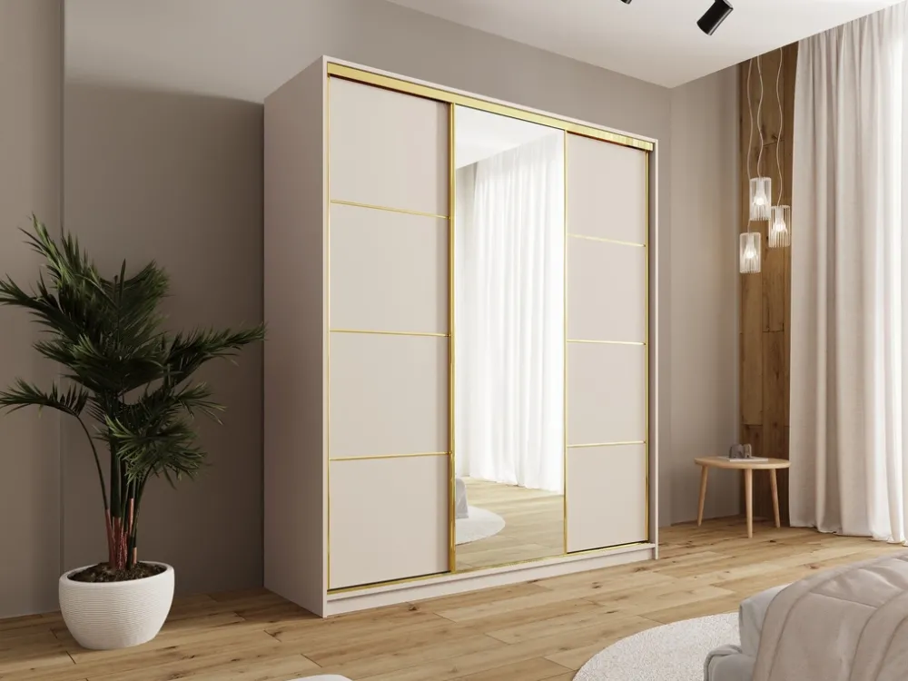 Dodaj swojej sypialni nuty luksusu i porządku dzięki eleganckiej szafie przesuwnej o szerokości 180 cm. Połączenie lustra, złotych detali i praktycznego układu wnętrza sprawia, że to idealne rozwiązanie do przechowywania ubrań, które jednocześnie staje się ozdobą wnętrza. Środkowe drzwi z lustrem optycznie powiększają przestrzeń, a złoty system przesuwny ze szprosami nadaje szafie nowoczesny, a zarazem szykowny charakter.