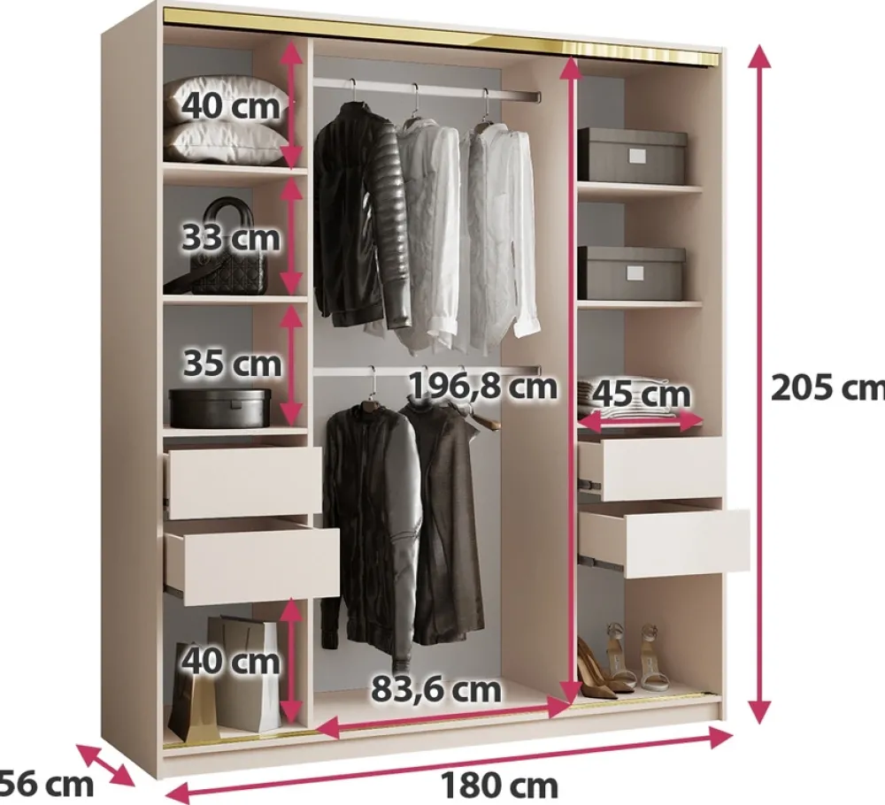- Szafa przesuwna z lustrem 180 cm GOLD NEW charakteryzuje się pojemnym wnętrzem oraz nowoczesnym designem. Środkowe drzwi szafy zostały wzbogacone o duże lustro, wewnątrz znajduje się osiem półek na ubrania, cztery szuflady, oraz dwa drążki na wieszaki.