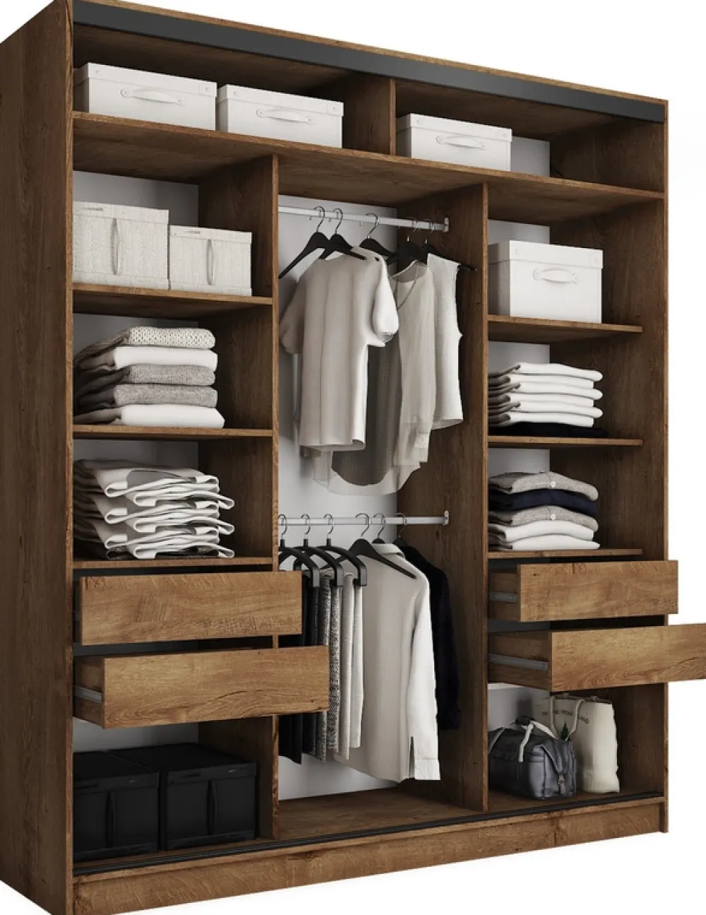 Cztery szuflady umieszczone po lewej i prawej stronie poruszają się na prowadnicach kulkowych, co gwarantuje płynne i ciche otwieranie. Idealne do przechowywania mniejszych przedmiotów, takich jak bielizna, akcesoria czy dokumenty. Dzięki nim zyskasz więcej przestrzeni w głównych częściach szafy, co pomoże w utrzymaniu porządku.