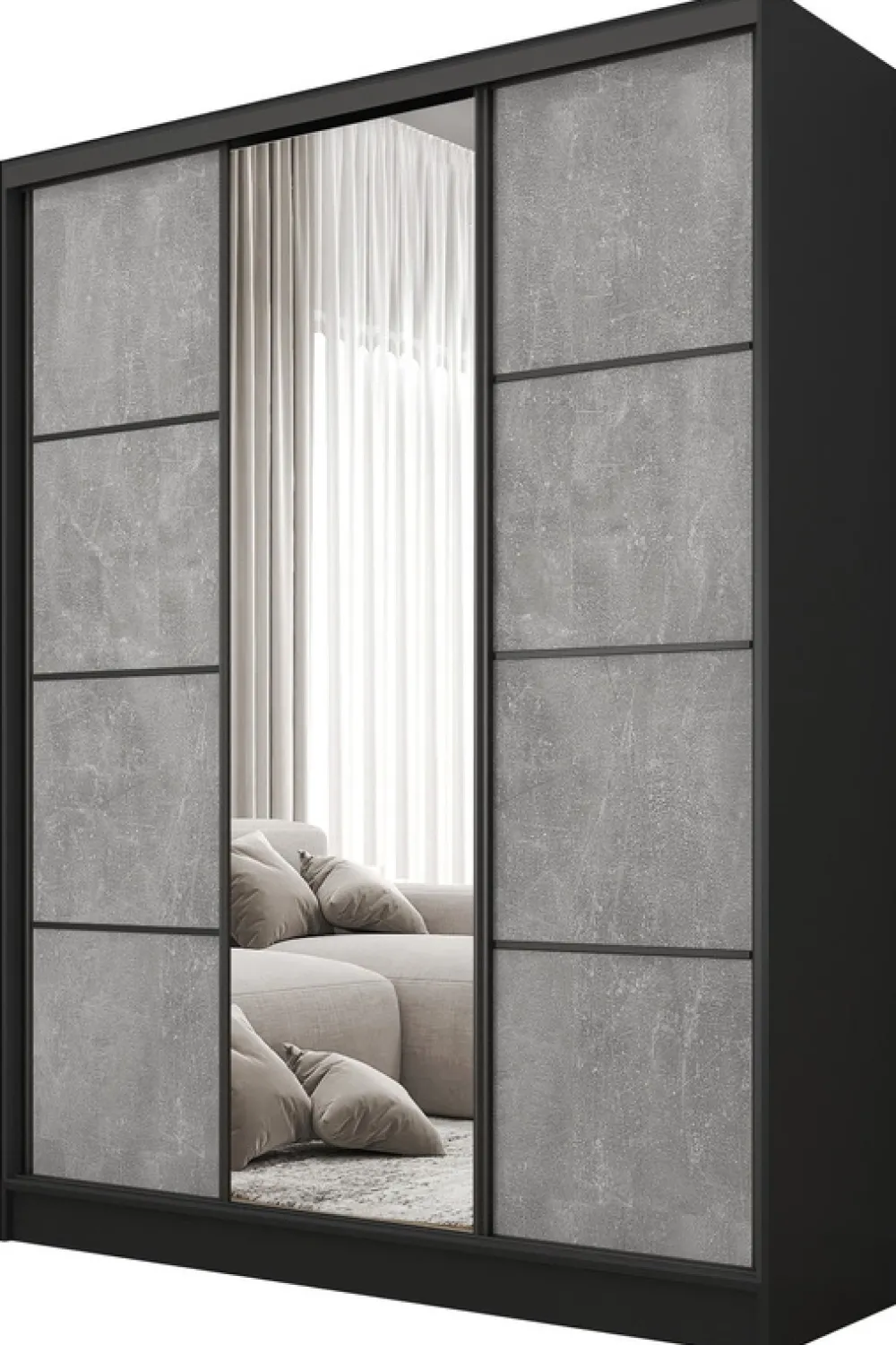 Aluminiowy system przesuwny gwarantuje płynne i ciche otwieranie oraz zamykanie drzwi szafy. Lustro umieszczone na centralnych drzwiach szafy nie tylko dodają szafie elegancji, ale również optycznie powiększają przestrzeń, co jest szczególnie korzystne w mniejszych pomieszczeniach.