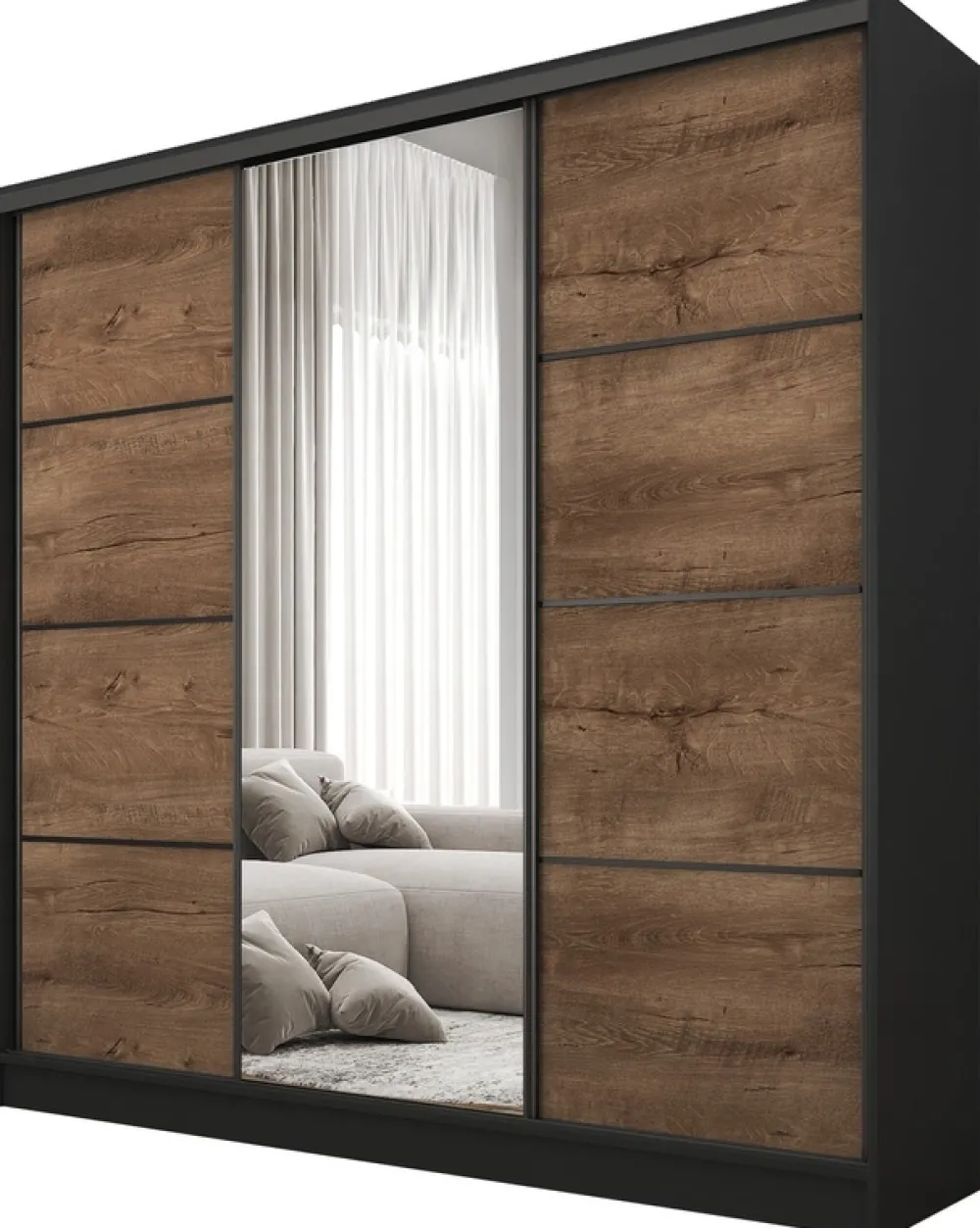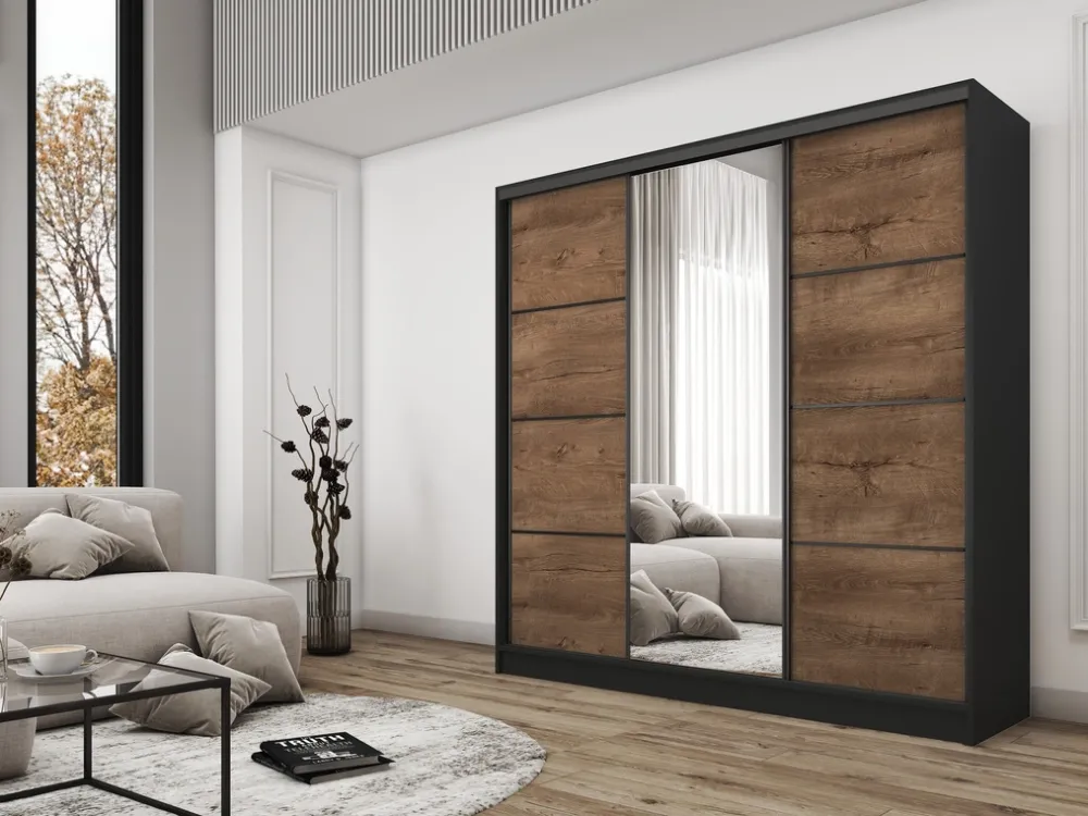 Nowoczesna szafa przesuwna BEST o szerokości 180 cm, jest idealnym dodatkiem do każdego nowoczesnego wnętrza. Jej czyste linie i minimalistyczny design sprawiają, że doskonale wpisuje się w estetykę współczesnych przestrzeni. Lustro umieszczone w centralnej części szafy nie tylko dodaje elegancji, ale również optycznie powiększają przestrzeń, czyniąc każde pomieszczenie jaśniejszym i bardziej przestronnym.