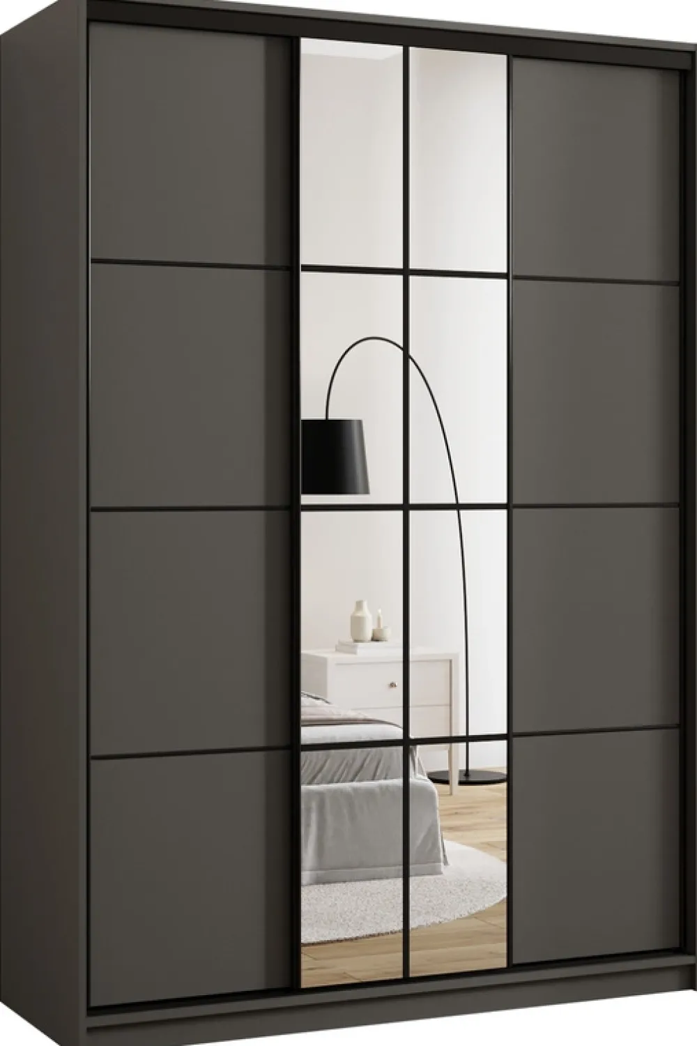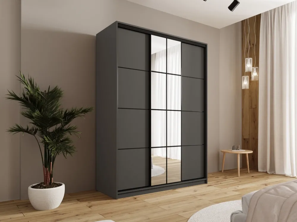 Poznaj wyjątkową szafę przesuwną z lustrem EDGE, która łączy w sobie nowoczesny design, praktyczne rozwiązania i wysoką jakość wykonania. Ten elegancki mebel to doskonałe uzupełnienie każdej sypialni, garderoby lub przedpokoju. Drzwi przesuwne poruszają się na wytrzymałym stalowym systemie w czarnym kolorze, który zapewnia płynność i trwałość użytkowania. Całość dopełniają czarne stalowe uchwyty, podkreślające nowoczesny charakter mebla.