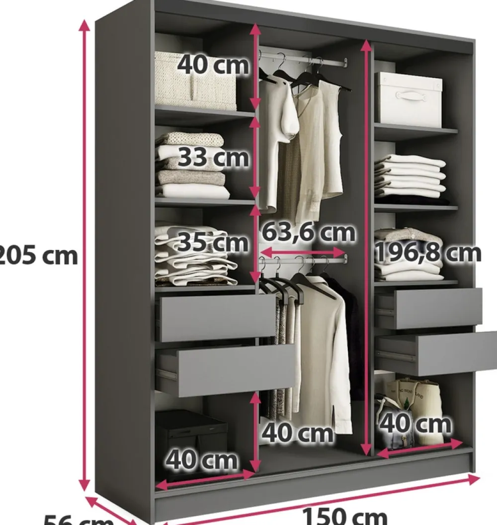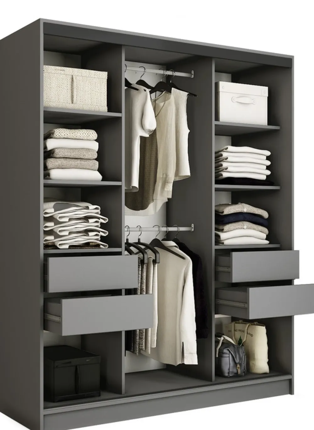 Wykonana z wysokiej jakości materiałów, ta szafa przesuwna z lustrem to nie tylko funkcjonalny mebel, ale również stylowy element wnętrza. Dzięki połączeniu przemyślanego układu półek, szuflad i drążków z eleganckim wykończeniem, stanowi idealny wybór dla osób poszukujących praktycznych i estetycznych rozwiązań w aranżacji wnętrz. Nowoczesna szafa pozwoli Ci zorganizować przestrzeń, nadając pomieszczeniu wyjątkowego charakteru.