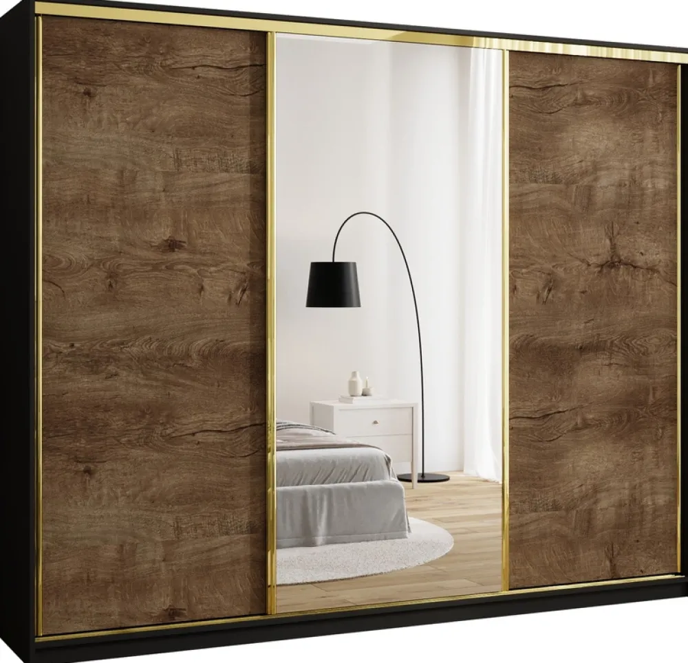 Dodaj swojej sypialni nuty luksusu i porządku dzięki eleganckiej szafie przesuwnej o szerokości 250 cm. Połączenie lustra, złotych detali i praktycznego układu wnętrza sprawia, że to idealne rozwiązanie do przechowywania ubrań, które jednocześnie staje się ozdobą wnętrza. Środkowe drzwi z lustrem optycznie powiększają przestrzeń, a złoty system przesuwny ze szprosami nadaje szafie nowoczesny, a zarazem szykowny charakter.