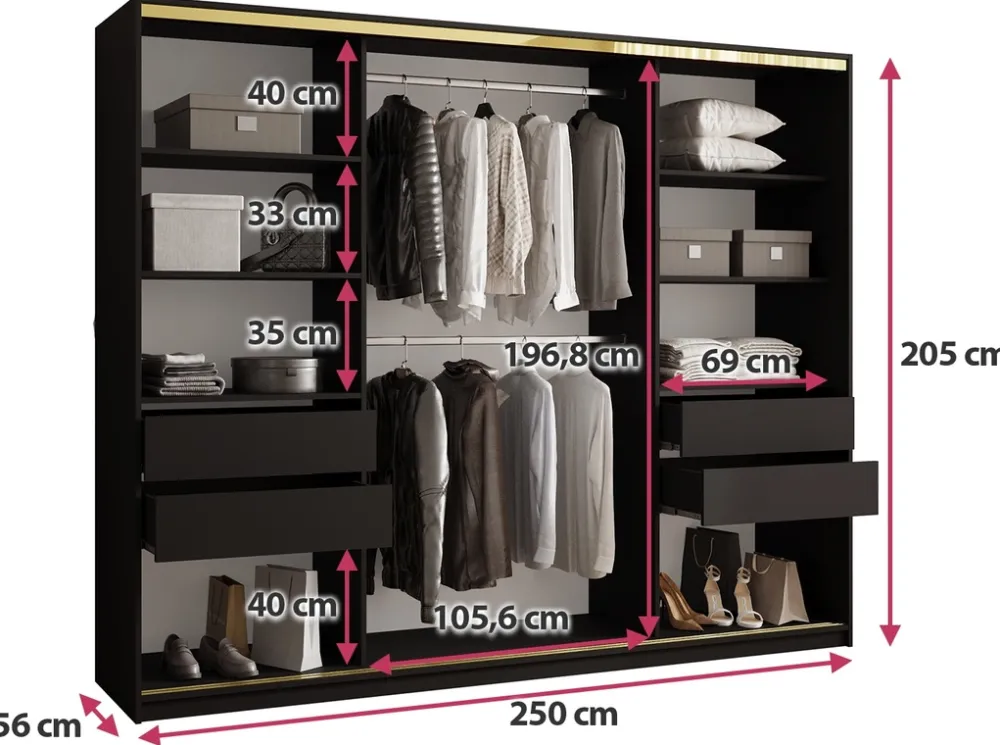 - Szafa przesuwna z lustrem 250 cm GOLD NEW charakteryzuje się pojemnym wnętrzem oraz nowoczesnym designem. Środkowe drzwi szafy zostały wzbogacone o duże lustro, wewnątrz znajduje się osiem półek na ubrania, cztery szuflady, oraz dwa drążki na wieszaki.