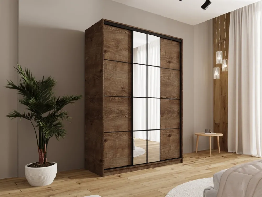 Wykonana z wysokiej jakości materiałów, ta szafa przesuwna z lustrem to nie tylko funkcjonalny mebel, ale również stylowy element wnętrza. Dzięki połączeniu przemyślanego układu półek, szuflad i drążków z eleganckim wykończeniem, stanowi idealny wybór dla osób poszukujących praktycznych i estetycznych rozwiązań w aranżacji wnętrz. Nowoczesna szafa pozwoli Ci zorganizować przestrzeń, nadając pomieszczeniu wyjątkowego charakteru.