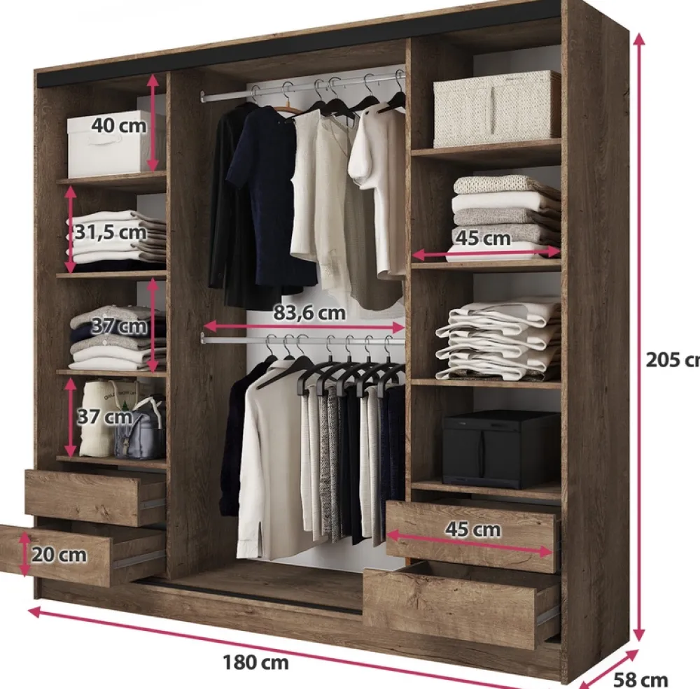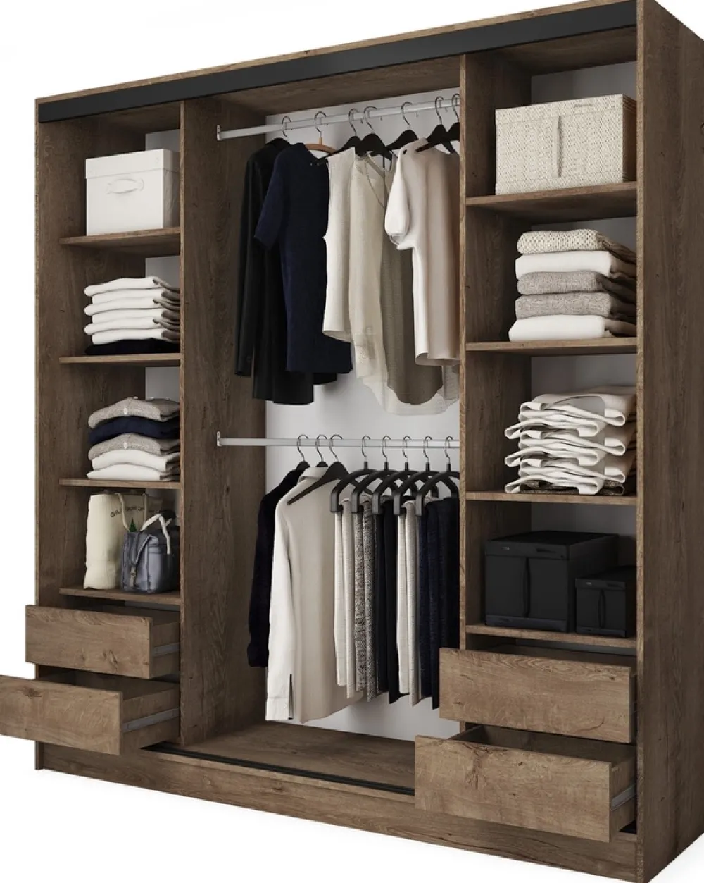 Wewnątrz szafy znajduje się osiem praktycznych półek, które zapewniają mnóstwo miejsca do przechowywania ubrań, dodatków i innych przedmiotów. Cztery szuflady osadzone na prowadnicach kulkowych umożliwiają łatwe segregowanie mniejszych elementów garderoby, co czyni porządkowanie prostszym i bardziej intuicyjnym.