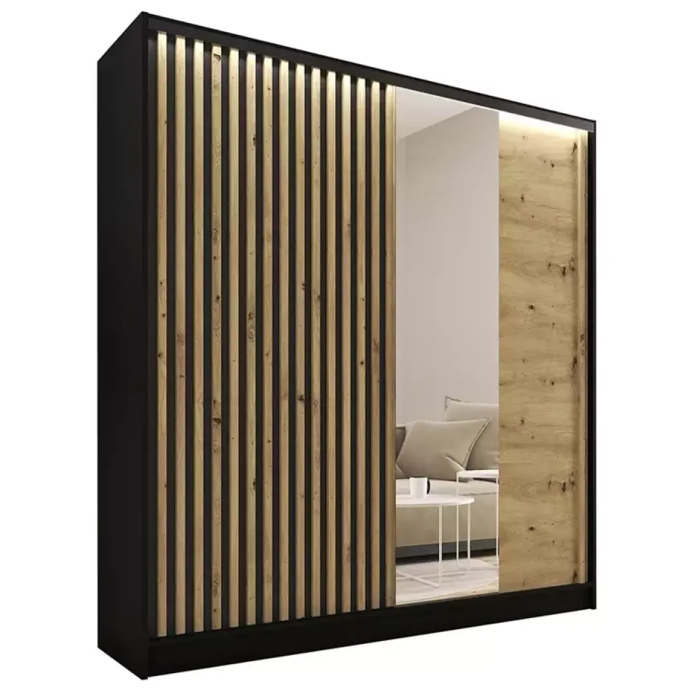 - Szafa niewyposażona w tradycyjne uchwyty, otwieranie odbywa się za pomocą listew przymocowanych do frontu.