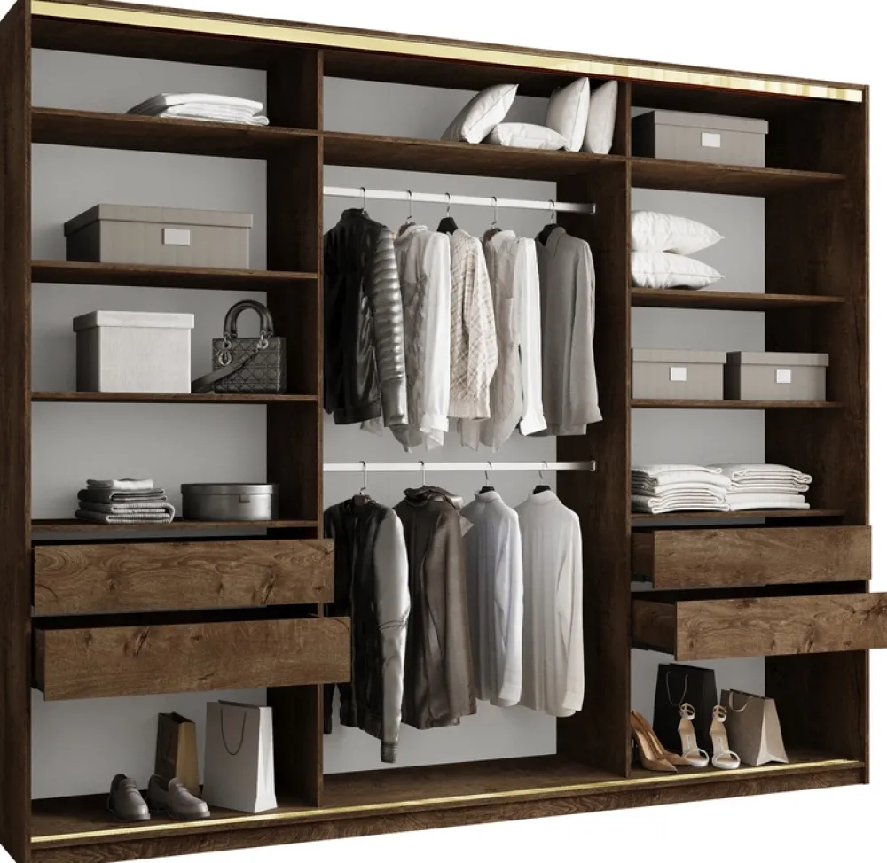 Wykończenie w kolorze złota to propozycja dla tych, którzy szukają nowoczesnego designu z nutą elegancji. Połączenie funkcjonalności i estetyki sprawia, że szafa idealnie wpisuje się zarówno w styl glamour, jak i minimalistyczne aranżacje.