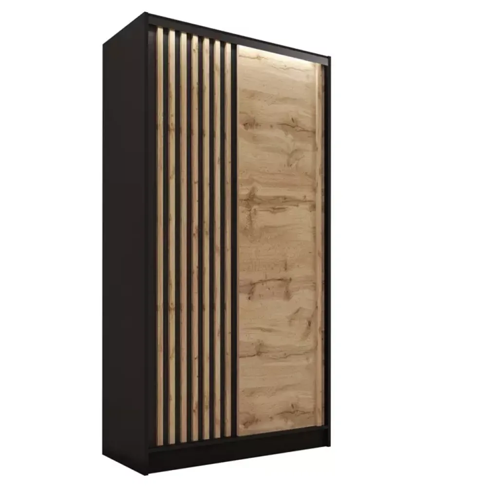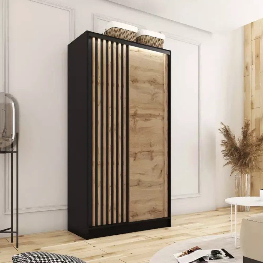 - Szafa niewyposażona w tradycyjne uchwyty, otwieranie odbywa się za pomocą listew przymocowanych do frontu.