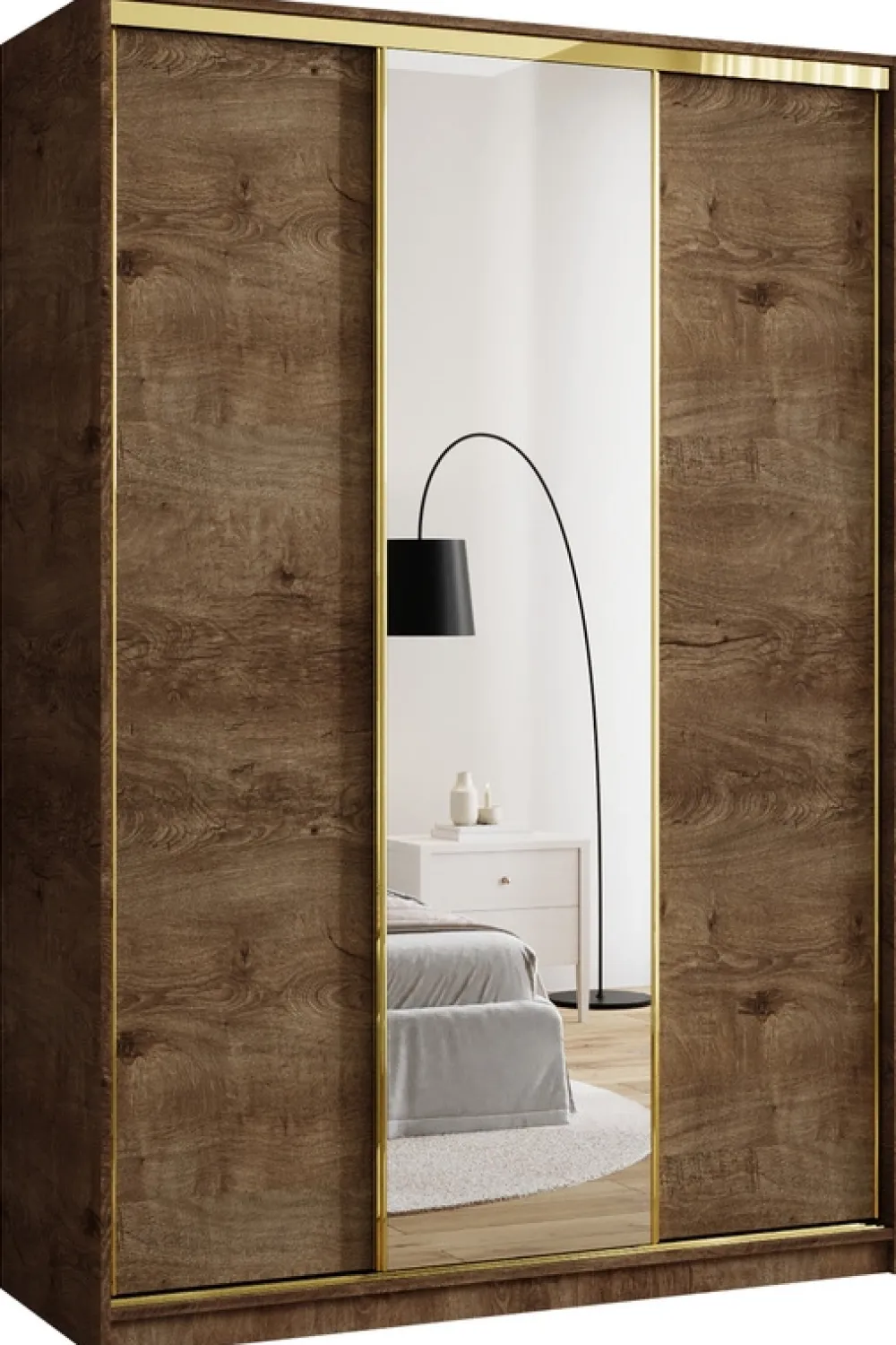 Dodaj swojej sypialni nuty luksusu i porządku dzięki eleganckiej szafie przesuwnej o szerokości 150 cm. Połączenie lustra, złotych detali i praktycznego układu wnętrza sprawia, że to idealne rozwiązanie do przechowywania ubrań, które jednocześnie staje się ozdobą wnętrza. Środkowe drzwi z lustrem optycznie powiększają przestrzeń, a złoty system przesuwny ze szprosami nadaje szafie nowoczesny, a zarazem szykowny charakter.