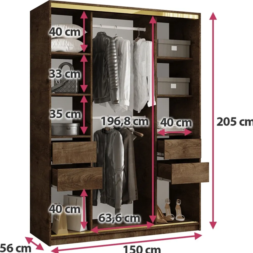 - Szafa przesuwna z lustrem 150 cm GOLD NEW charakteryzuje się pojemnym wnętrzem oraz nowoczesnym designem. Środkowe drzwi szafy zostały wzbogacone o duże lustro, wewnątrz znajduje się osiem półek na ubrania, cztery szuflady, oraz dwa drążki na wieszaki.
