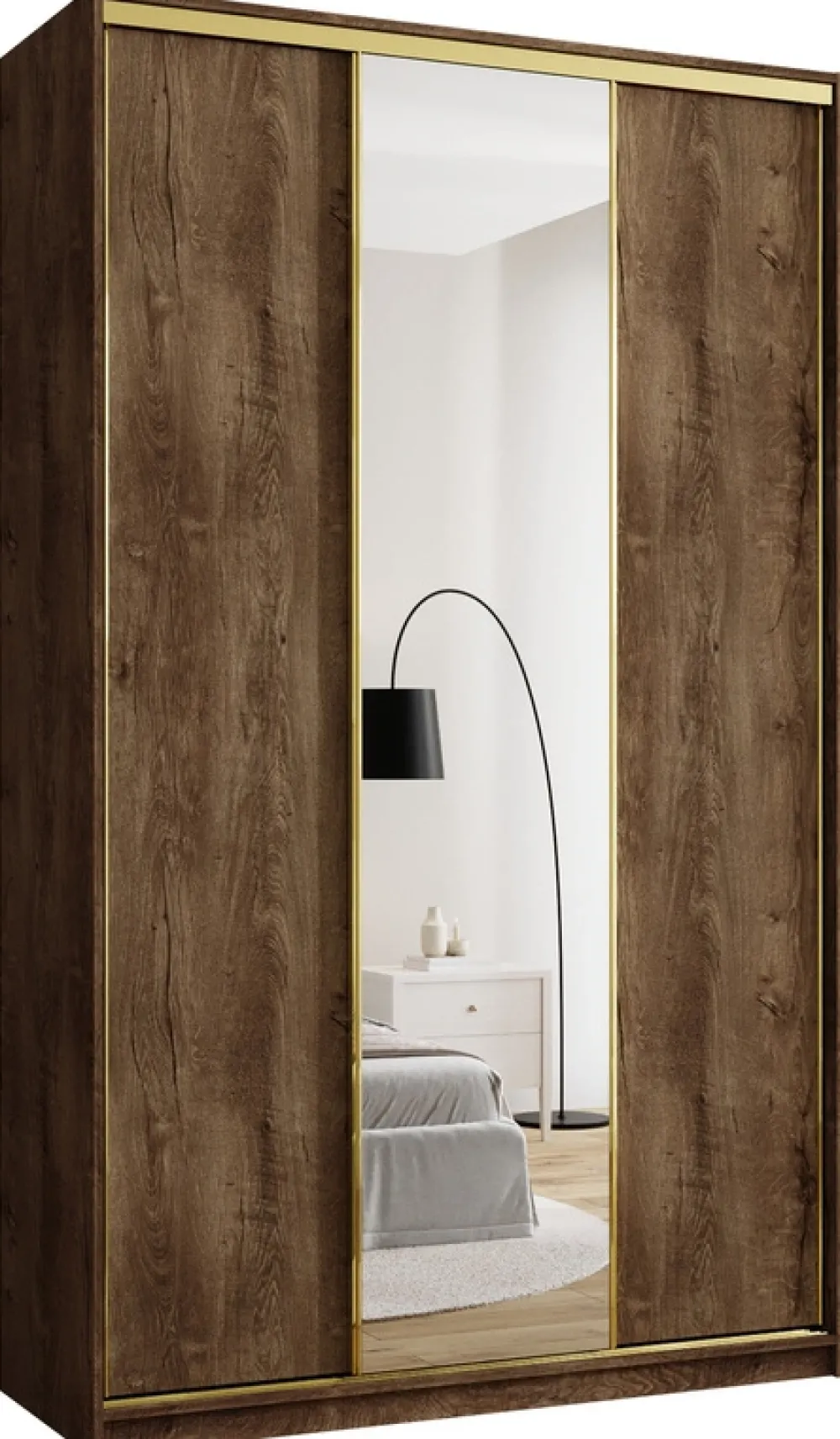 - Szafa przesuwna z lustrem 150 cm GOLD NEW MAX charakteryzuje się swoją wysokością 235 cm, dzięki czemu jest niezwykle pojemna. Szafa posiada trzy drzwi osadzone na stalowym systemie przesuwnym, liczne półki, cztery pojemne szuflady i dwa drążki.