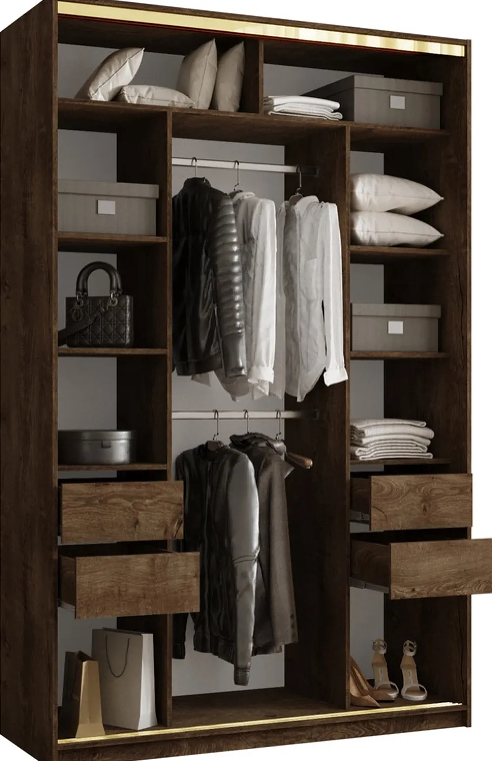 Wykończenie w kolorze złota to propozycja dla tych, którzy szukają nowoczesnego designu z nutą elegancji. Połączenie funkcjonalności i estetyki sprawia, że szafa idealnie wpisuje się zarówno w styl glamour, jak i minimalistyczne aranżacje.