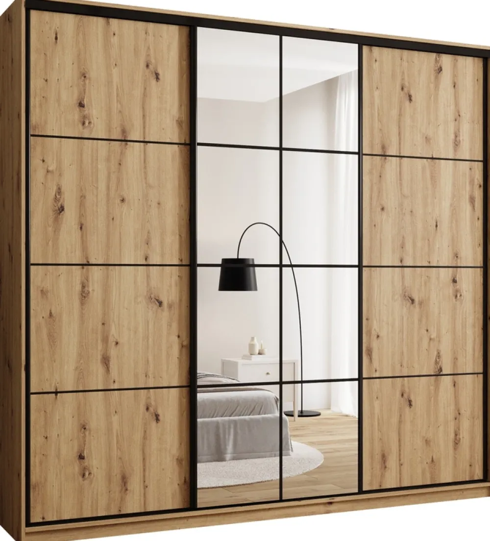 Szafa przesuwna o szerokości 250 cm to idealne rozwiązanie do dużych przestrzeni, które wymagają przemyślanej organizacji i nowoczesnego stylu. Wyposażona w stalowy system przesuwny w czarnym kolorze, zapewnia nie tylko płynną i cichą pracę, ale także podkreśla jej industrialny, modny charakter.