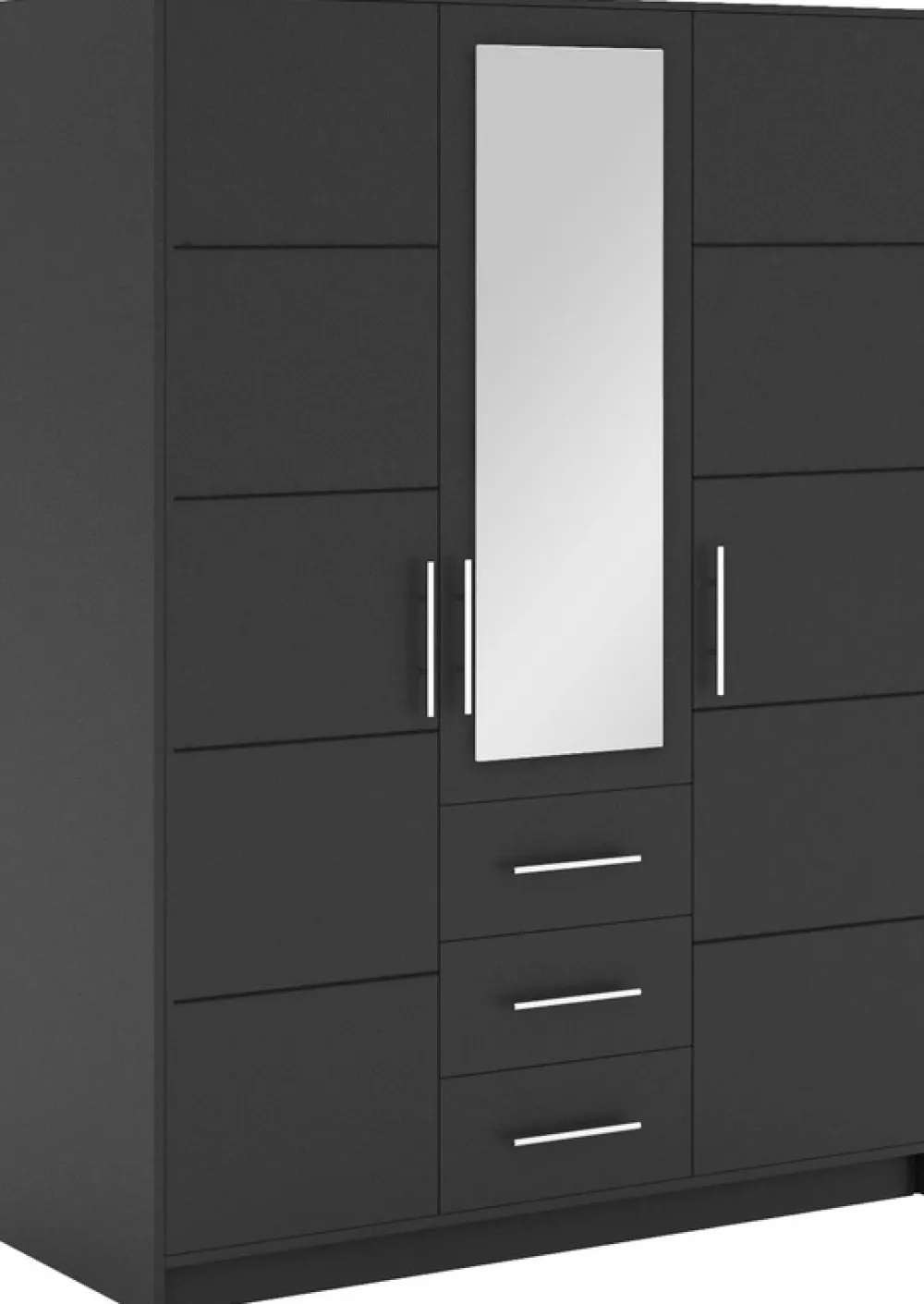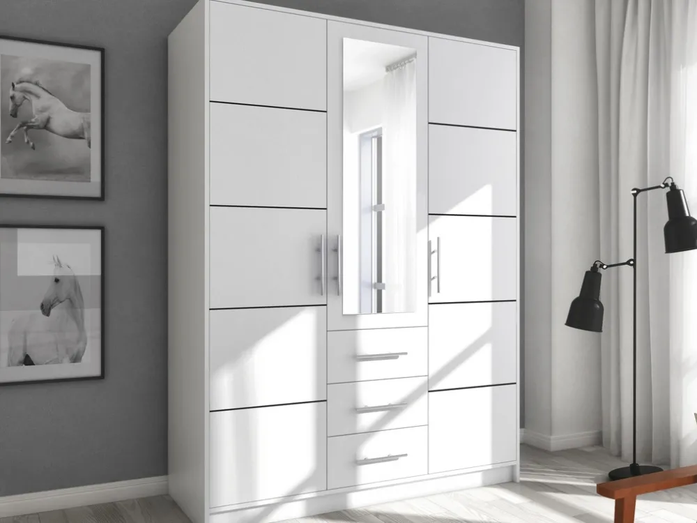 - Szafa trzydrzwiowa 147 cm BILL posiada aluminiowy drążek na wieszaki, półki na ubrania oraz trzy głębokie szuflady na bieliznę. Lustro umieszczone na środkowych drzwiach w świetny sposób rozjaśnia pomieszczenie.