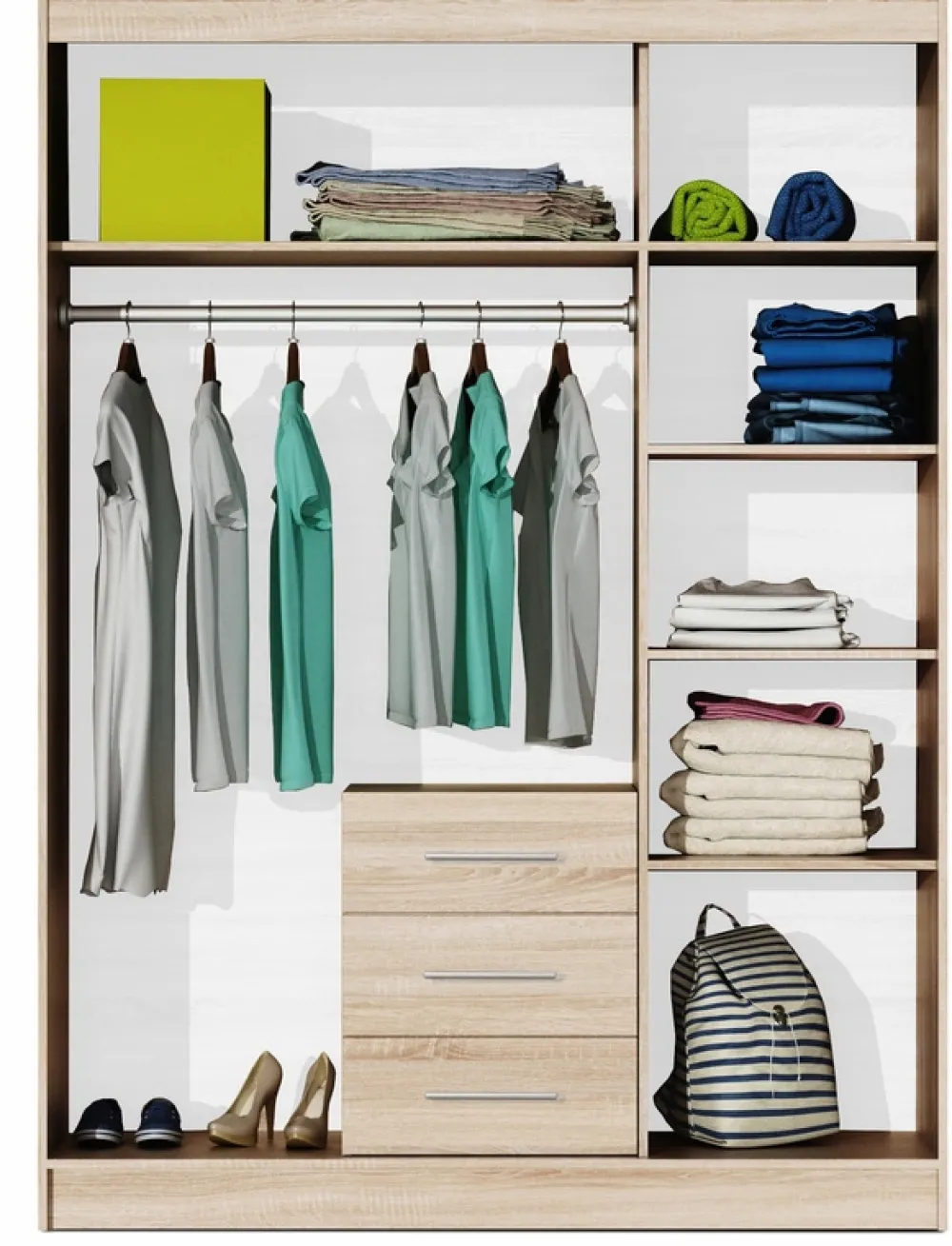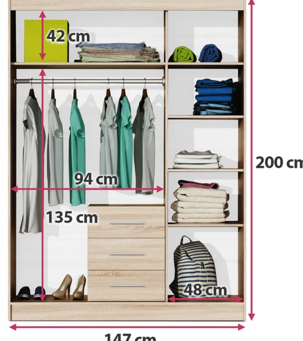 Za lewymi i środkowymi drzwiami znajduje się przestronny drążek na wieszaki, który idealnie nadaje się do przechowywania koszul, sukienek i innych odzieżowych elementów wymagających rozwieszenia. Dodatkowo nad drążkiem umieszczona jest praktyczna półka, idealna na pudełka z dodatkami lub sezonowe ubrania.