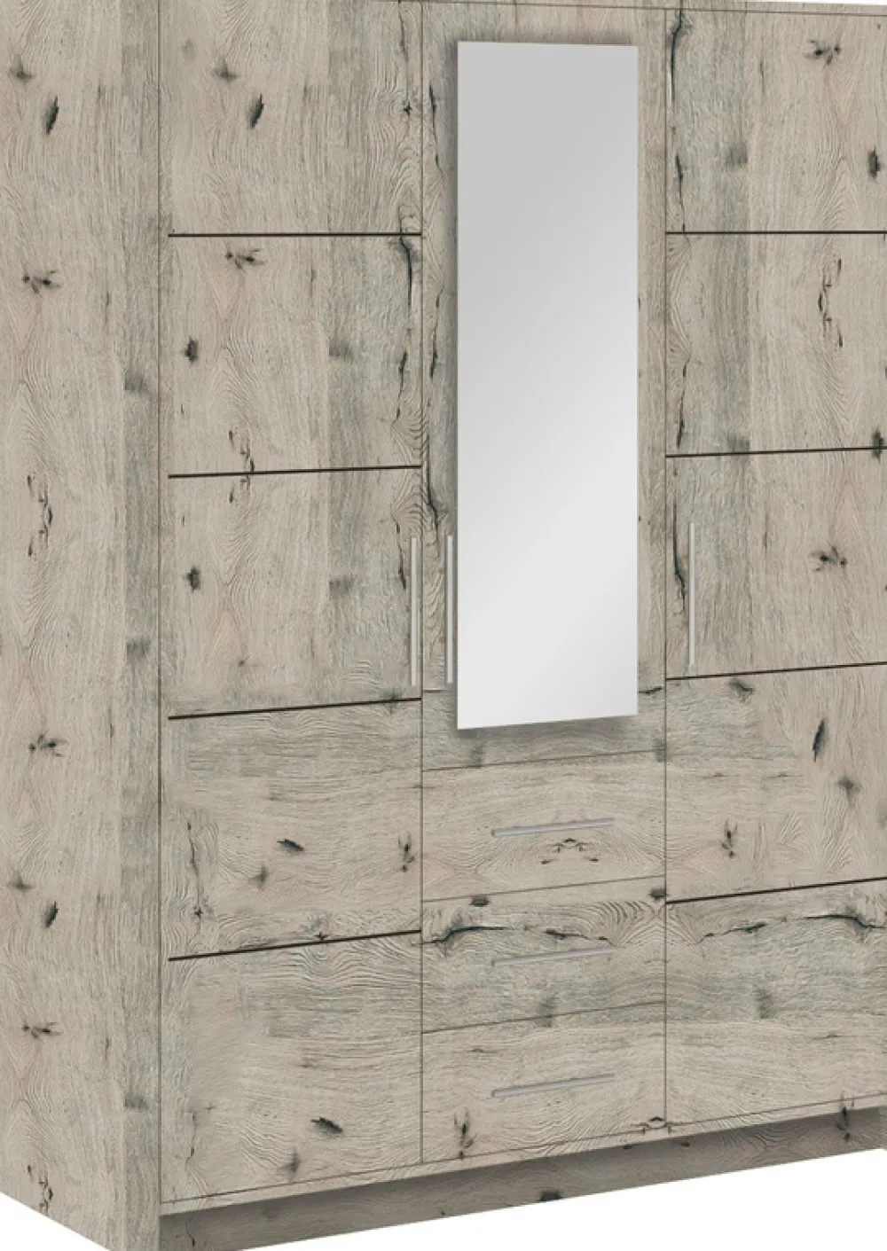 Pod środkowymi drzwiami znajdziesz trzy pojemne szuflady, które zapewniają wygodne miejsce na przechowywanie drobnych akcesoriów, takich jak bielizna, skarpetki czy inne codzienne przedmioty. Dzięki głębokim szufladom wszystko będzie zawsze pod ręką, a przestrzeń w szafie maksymalnie wykorzystana.
