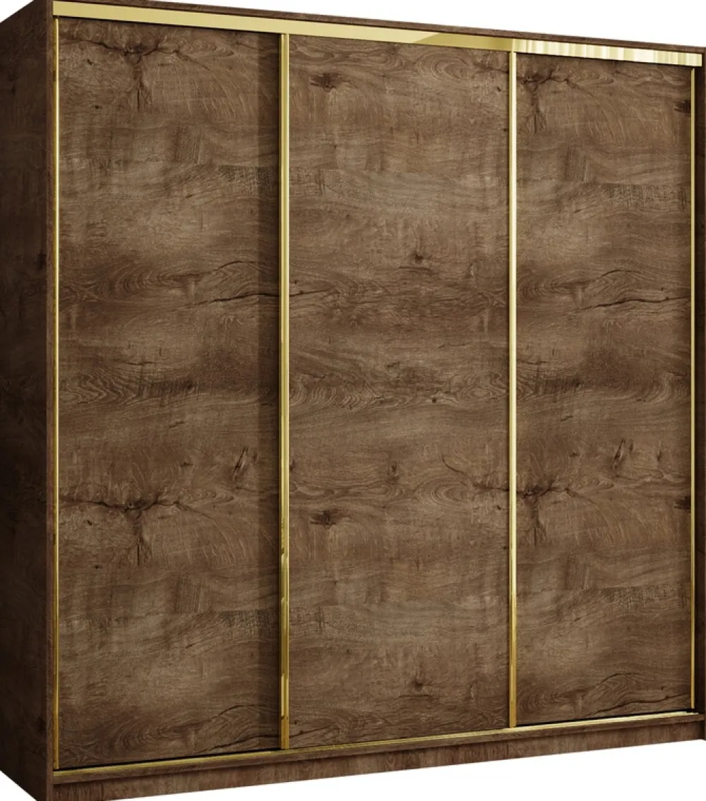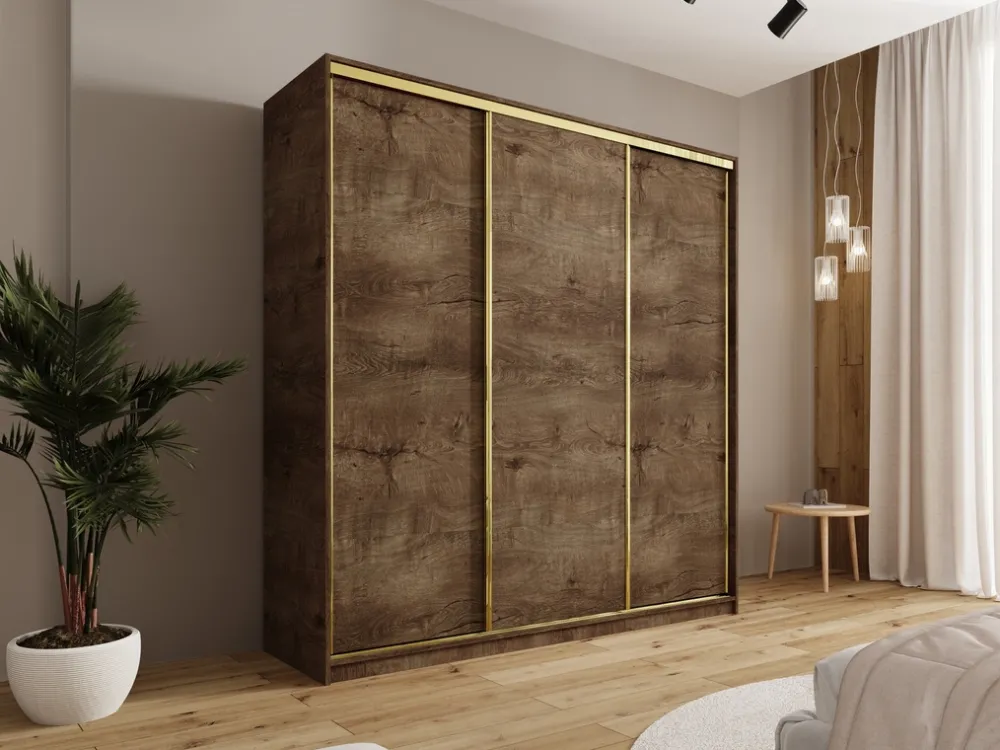 Złote detale nadają szafie wyjątkowego charakteru i sprawiają, że staje się nie tylko praktycznym, ale i dekoracyjnym elementem wnętrza. System przesuwny ze stali gwarantuje komfort użytkowania na co dzień, a solidne wykończenie obrzeży zabezpiecza mebel przed uszkodzeniami.