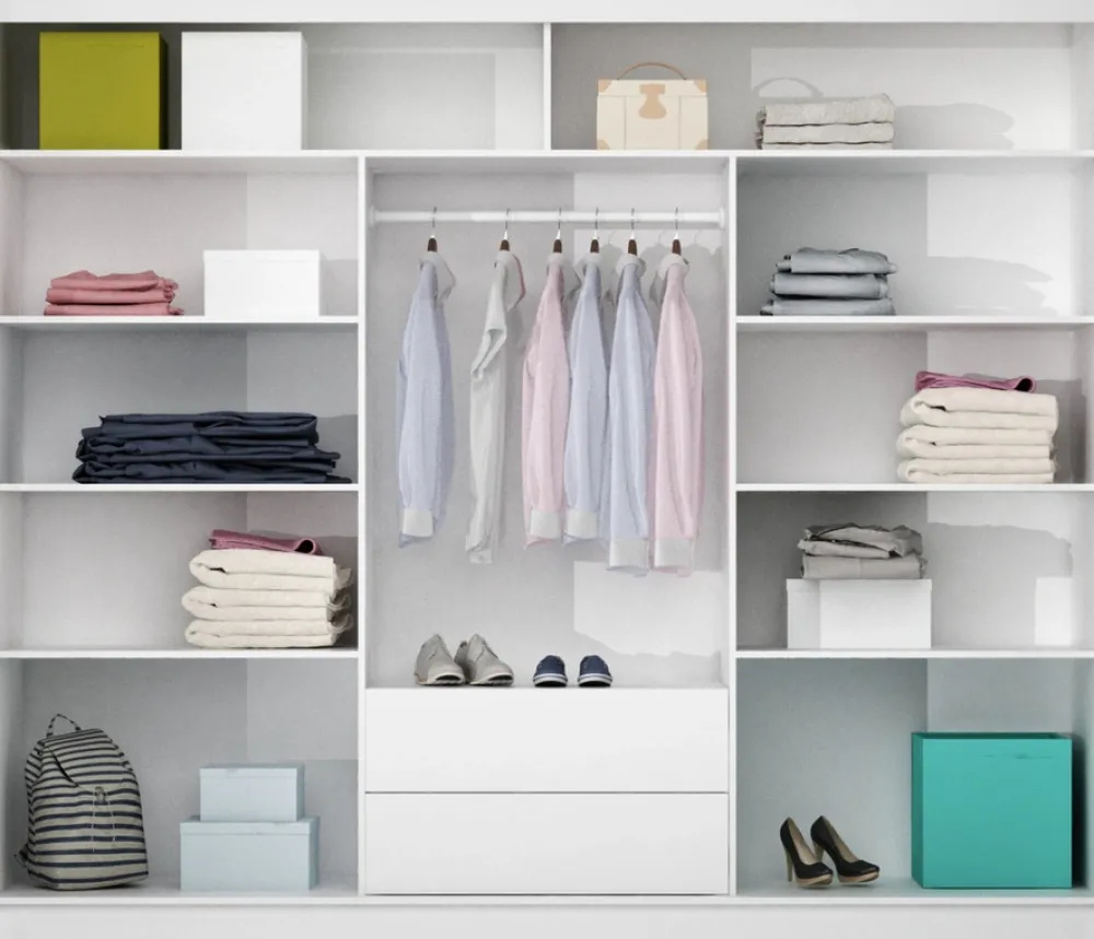 Po prawej i lewej stronie szafy znajduje się po pięć funkcjonalnych półek, które oferują mnóstwo miejsca na przechowywanie złożonych ubrań, pościeli, ręczników oraz innych akcesoriów. Przemyślany układ półek ułatwia organizację garderoby, dzięki czemu wszystkie przedmioty są zawsze na swoim miejscu i w zasięgu ręki.