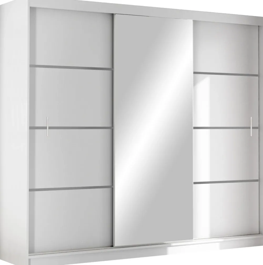 - Szafa przesuwna 250 cm VOTIS posiada pięć półek po prawej oraz lewej stronie. W środkowej części mebla znajduje się aluminiowy drążek na wieszaki oraz dwie głębokie szuflady na bieliznę i akcesoria. Środkowe drzwi zdobi duże lustro.