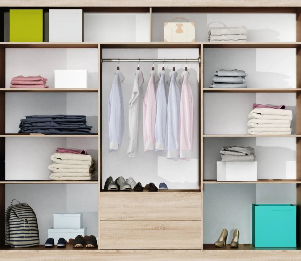 Pod drążkiem na wieszaki znajdują się dwie pojemne szuflady, które doskonale nadają się do przechowywania mniejszych przedmiotów, takich jak bielizna, skarpetki czy inne drobne akcesoria. Szuflady otwierają się płynnie, oferując szybki i łatwy dostęp do przechowywanych rzeczy.