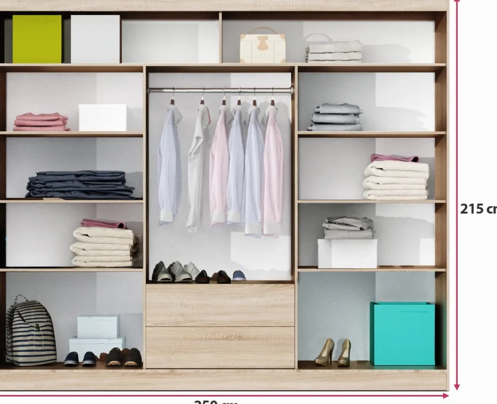 Szafa przesuwna o szerokości 250 cm to doskonałe połączenie nowoczesnego designu, funkcjonalności i przestronności. Dzięki przemyślanemu układowi półek, drążków oraz szuflad, a także eleganckiemu wykończeniu, stanie się ona nie tylko praktycznym, ale również stylowym elementem każdej sypialni czy garderoby.