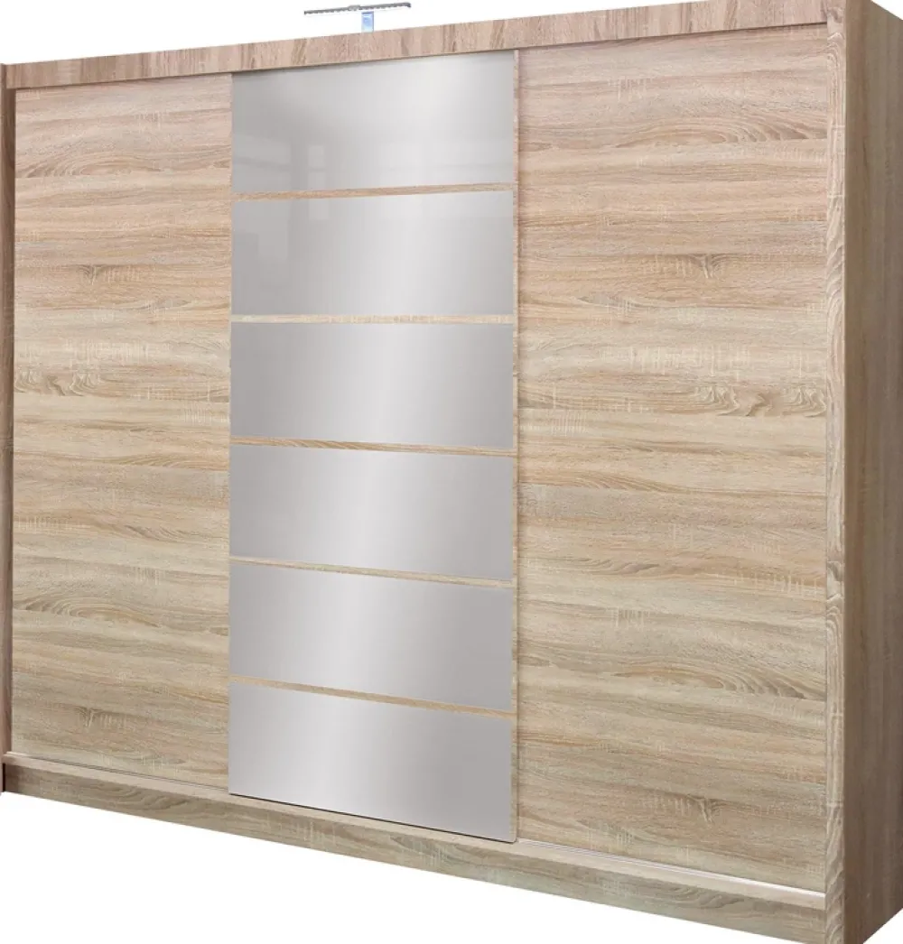 Szafa przesuwna o szerokości 250 cm MARGO to połączenie elegancji, funkcjonalności i przestronności, które idealnie wkomponuje się w każde nowoczesne wnętrze. Wyposażona w trzy drzwi przesuwne, szafa zapewnia wygodny dostęp do swojej zawartości, jednocześnie oszczędzając miejsce w pomieszczeniu. Środkowe drzwi z lustrem nie tylko dodają elegancji, ale również optycznie powiększają przestrzeń, wprowadzając więcej światła do wnętrza.