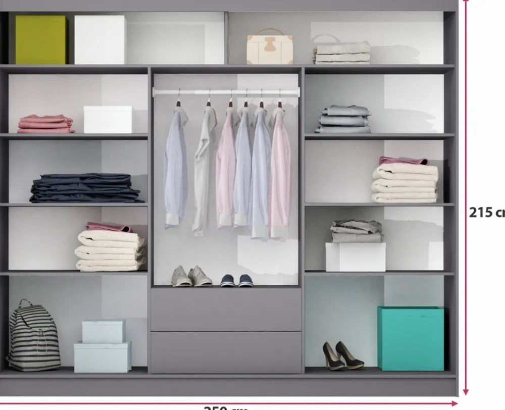 Szafa przesuwna o szerokości 250 cm to idealne rozwiązanie dla osób ceniących przestronność, funkcjonalność i stylowy design. Jej przemyślany układ półek, drążków oraz szuflad zapewni wygodne przechowywanie ubrań, a lustro wprowadzi do wnętrza nowoczesny akcent i dodatkową funkcjonalność.