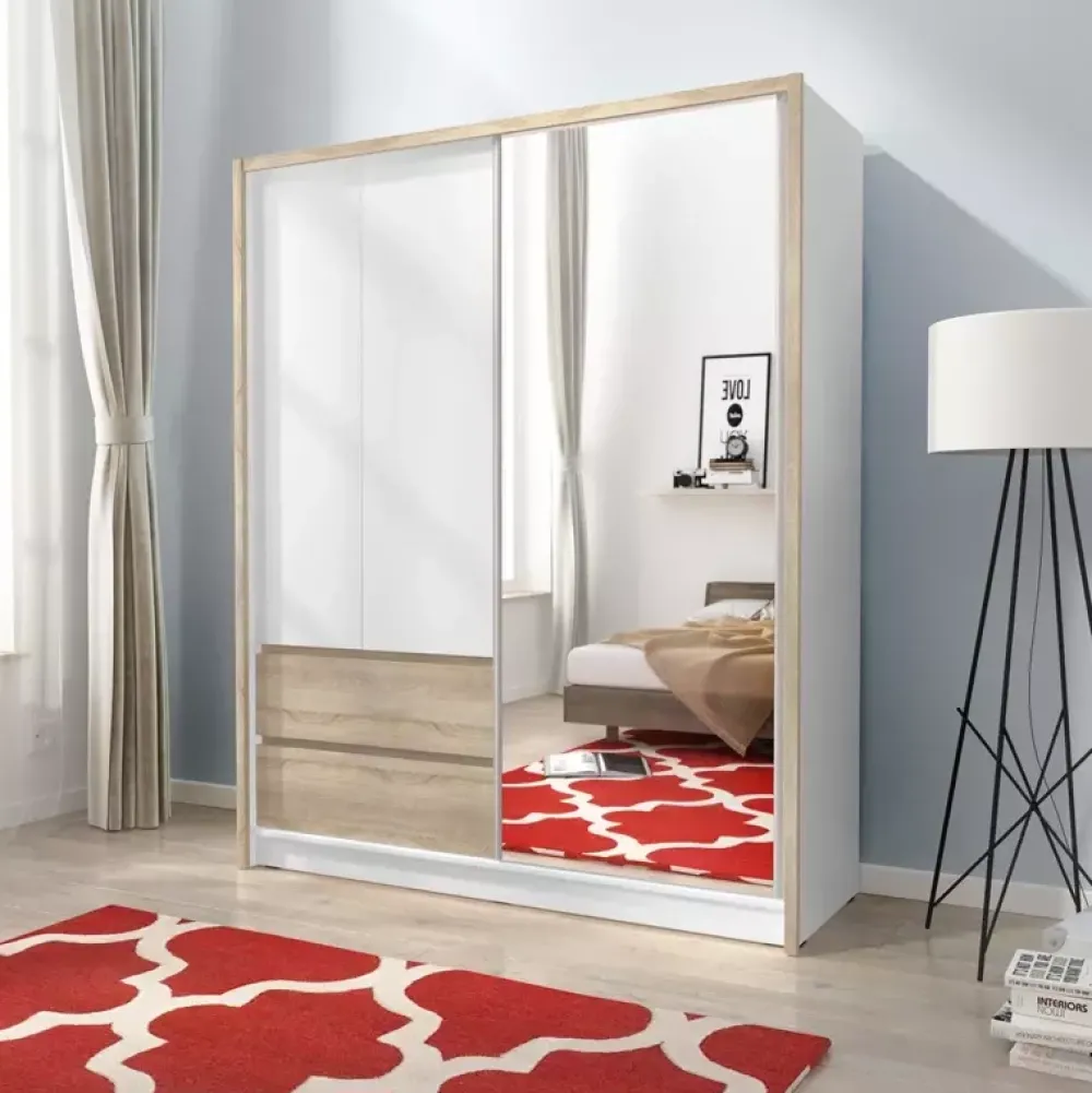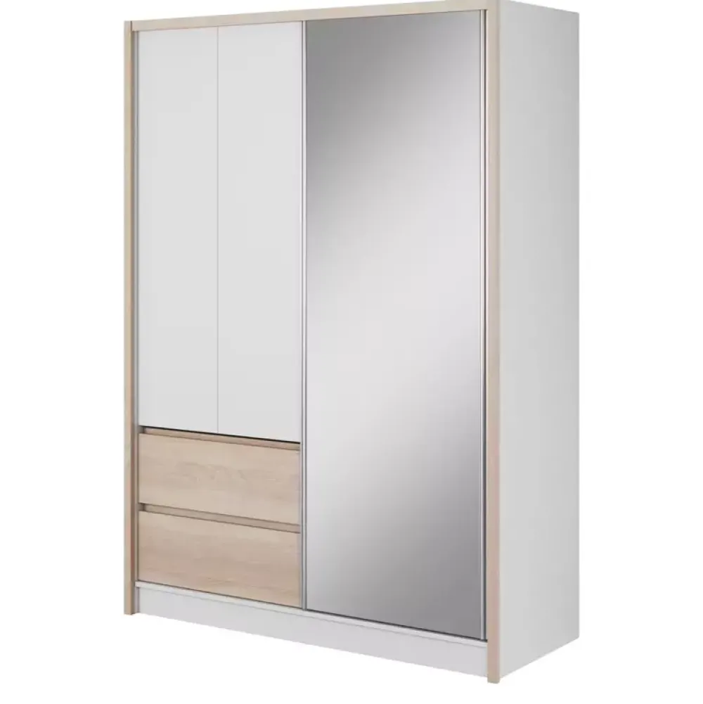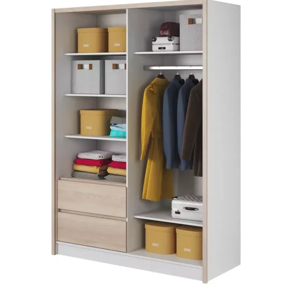 Połączenie trzech faktur w jednym modelu zachwyca designem, zobaczysz je w szafach w kolorystyce biały/dąb sonoma oraz biały/dąb artisan Jeśli jesteś zwolennikiem minimalizmu, szafa w wersji białej – bez dekoru drewna będzie dla Ciebie idealnym rozwiązaniem.