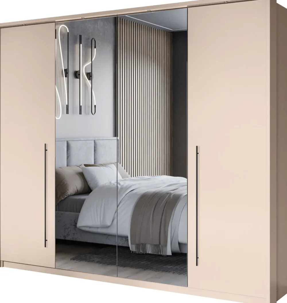 Korpus i fronty wykonano z laminowanej płyty meblowej o grubości 16 mm, a obrzeża zostały wykończone trwałym PCV. Fronty z lustrami pięknie komponują się z piaskowym odcieniem beżu, tworząc ponadczasowy i elegancki mebel do każdej sypialni.