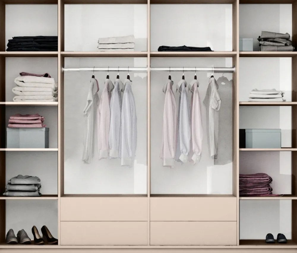 Szafa została zaprojektowana tak, by zapewnić maksymalne wykorzystanie przestrzeni. Oprócz dużej liczby półek i podwójnego drążka, cztery praktyczne szuflady umożliwiają łatwe posegregowanie drobnych elementów garderoby. Wbudowane oświetlenie LED sprawia, że wszystko masz zawsze w zasięgu wzroku – bez potrzeby włączania górnego światła.