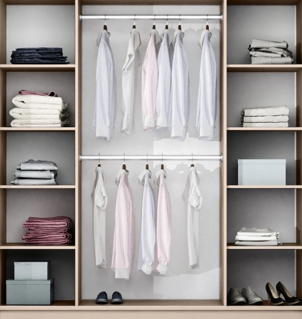 Szafa została zaprojektowana tak, by zapewnić maksymalne wykorzystanie przestrzeni. Duża liczba półek i dwa drążki umożliwiają łatwe posegregowanie drobnych elementów garderoby. Wbudowane oświetlenie LED sprawia, że wszystko masz zawsze w zasięgu wzroku – bez potrzeby włączania górnego światła.