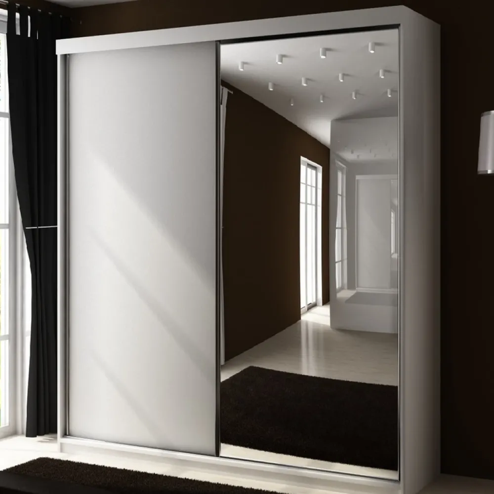 - Dwudrzwiowa szafa przesuwna do przedpokoju TARO 150×200×62 cm w białym kolorze. Wykonana z płyty laminowanej16 mm z lustrzanymi frontami. Wyposażona w aluminiowe prowadnice i krawędzie PCV. Wnętrze z półkami i drążkiem zapewnia optymalną organizację ubrań